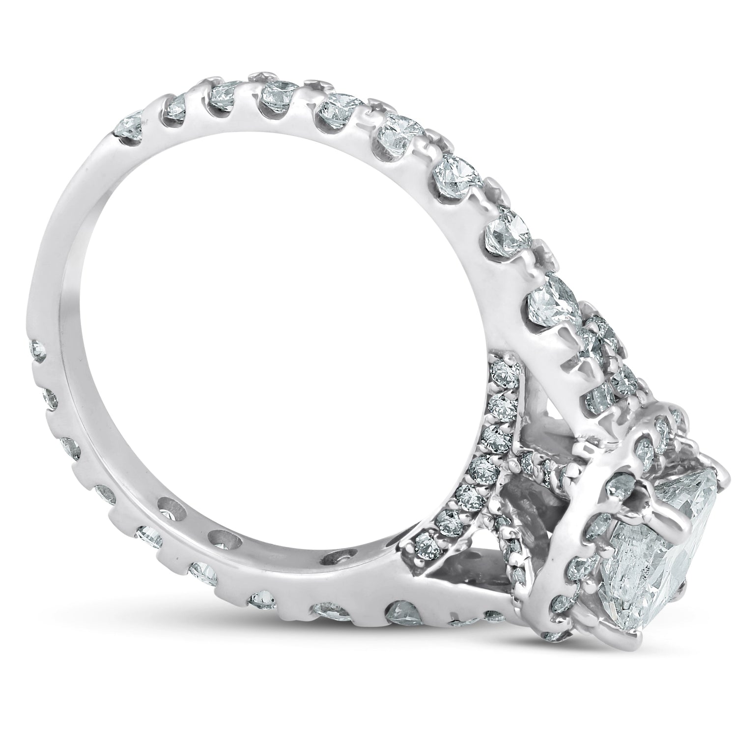 Handcrafted in 14K white gold with a 1 1/2ct cushion-cut lab-grown diamond and round cut lab-grown diamonds, totaling 2 1/2ct. Prong set in a high-polished setting.