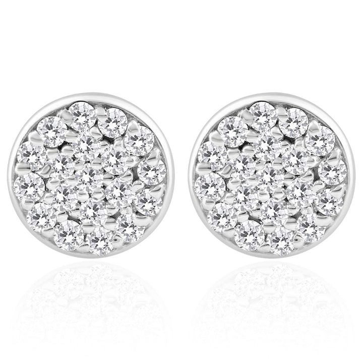 These 3/8 Ct EX3 Lab Grown Diamond Pave Stud Earrings by Pompeii3 are a dazzling pair of women's earrings featuring 38 round brilliant-cut genuine EX3 lab-grown diamonds. Set in high-polished 14k white gold, these pave set diamonds sparkle with every movement. The earrings are secured with 14k white gold push backs, ensuring a comfortable and secure fit. Measuring approximately 1/3 inch in diameter, these studs are perfect for adding a touch of elegance and sophistication to any outfit.