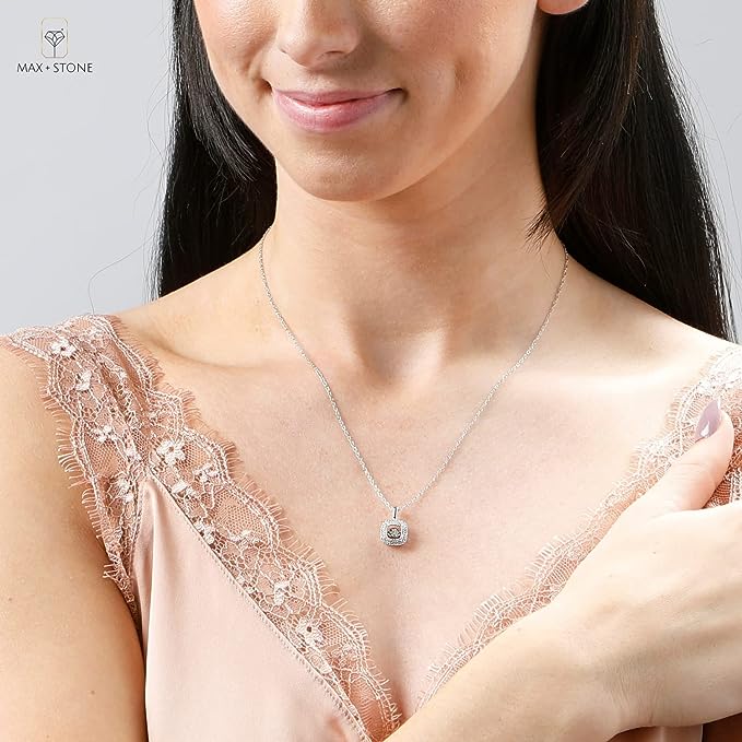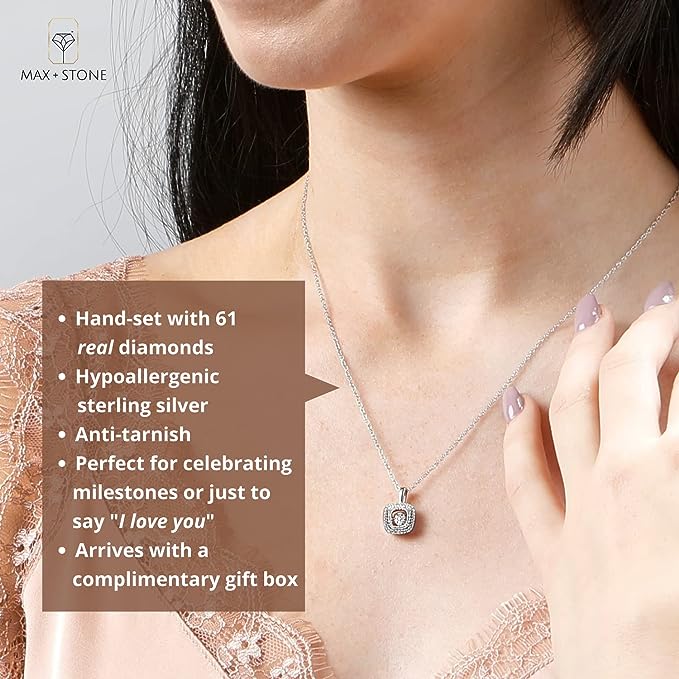 This Dancing Diamond Beloved Brilliance Pendant Necklace by MaxColor is a mesmerizing piece featuring 61 hand-set natural diamonds (1/5 cttw) in a dazzling cushion halo setting. The 925 sterling silver pendant and chain, enhanced with a rhodium finish for lasting shine, make this necklace a sophisticated choice for both casual and formal occasions. A timeless piece with enduring quality and style.