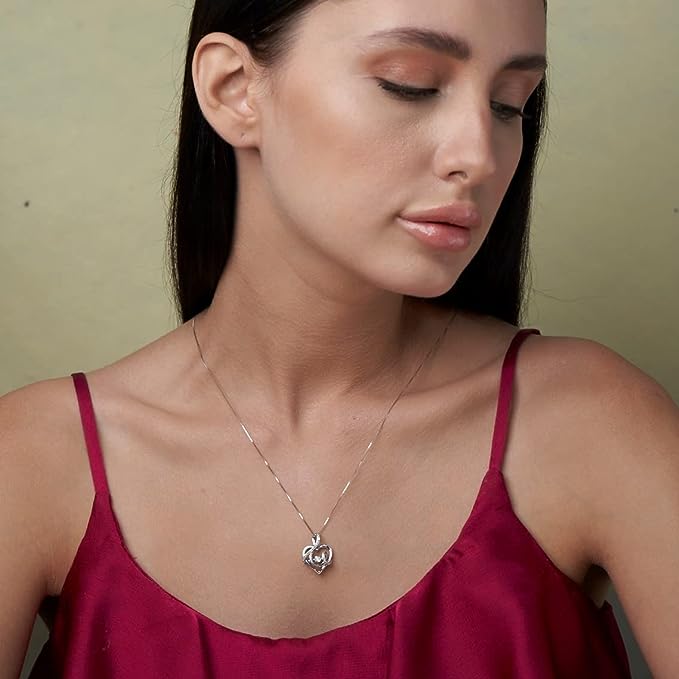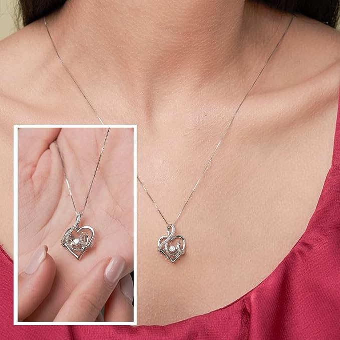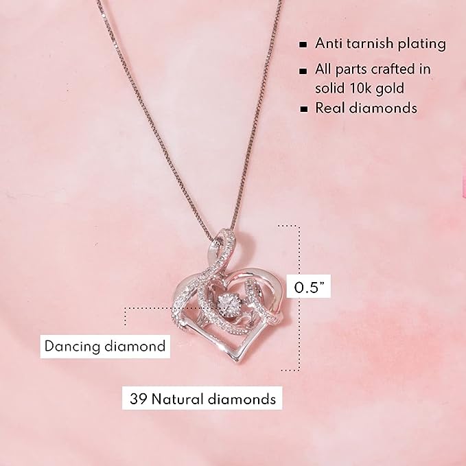 This Dancing Diamond Tied Together Pendant Necklace in 10k White Gold (1/6 ct) with 18 Inch Chain by MaxColor is an enchanting piece that brings a touch of elegance to any look. The pendant features 39 hand-set natural diamonds, weighing 1/6 carat total, which dance within the heart-shaped design. The 10k white gold pendant and chain are both crafted to the highest standards, ensuring long-lasting beauty and shine. The rhodium finish provides anti-tarnish properties, making this necklace a piece you can wear every day. Its timeless heart shape symbolizes love and connection, making it a perfect gift for a loved one.