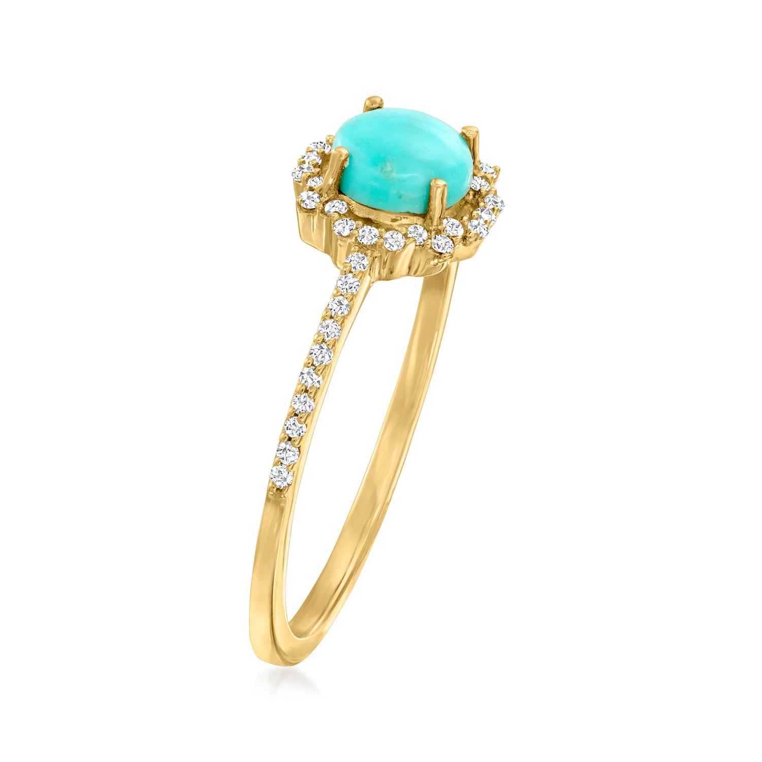 10kt yellow gold, 5mm stabilized turquoise cabochon, 0.13 carat of round brilliant-cut diamonds (44 stones). Diamond clarity: I2-I3, diamond color: I-J. Polished finish. Ring size: 5.
