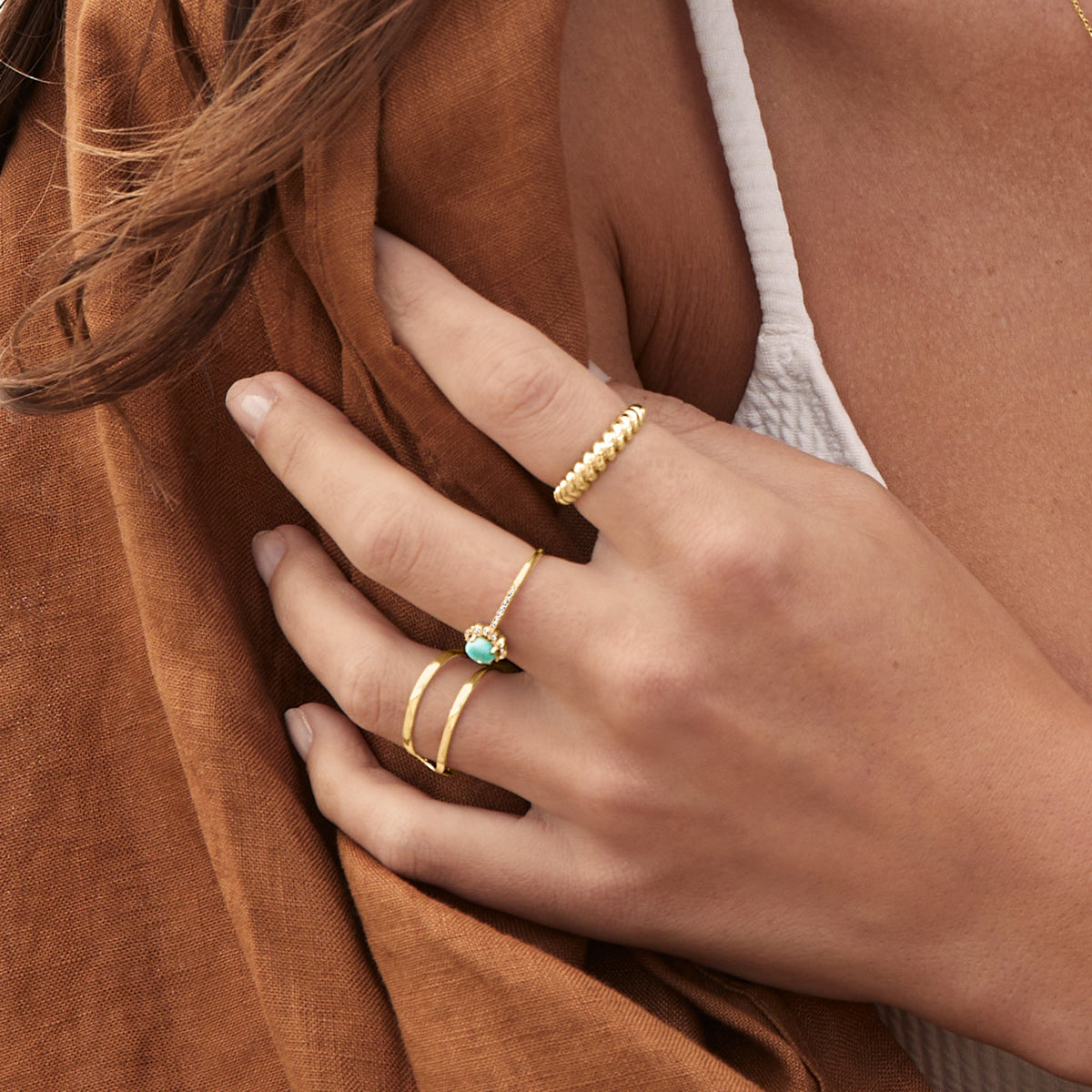 This Canaria Turquoise Halo Ring with Diamonds in 10kt Yellow Gold by Canaria offers a pop of vibrant blue with a 5mm round stabilized turquoise cabochon, encircled by diamonds. The ring combines natural beauty with the brilliance of diamonds in a unique design. The polished 10kt yellow gold band ensures durability, and the ring is ideal for everyday wear, offering a luxurious yet accessible piece to elevate your style.