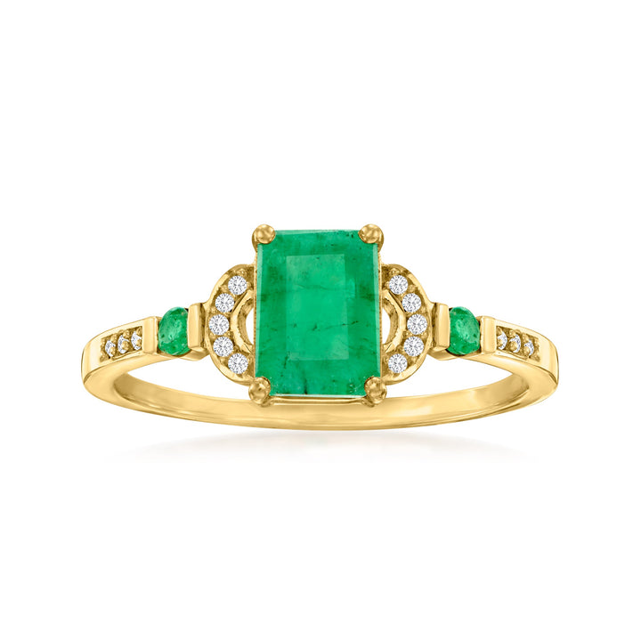 Crafted in 10kt yellow gold. Features 0.80 ct. emerald (emerald-cut) and 0.10 ct. t.w. round emeralds. Diamond accents (0.04 ct. t.w., I-J color, SI clarity). Prong setting. Ring size 5.