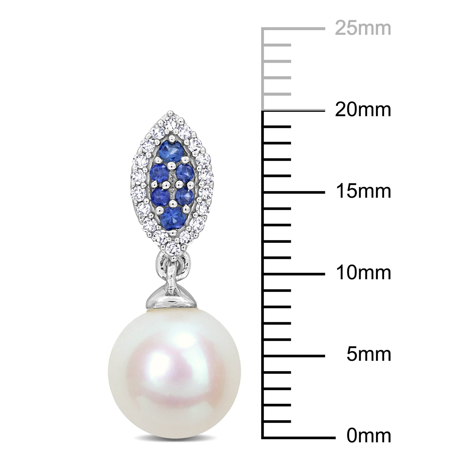 Crafted in 14k white gold with 8mm cultured freshwater pearls, 1/7ct TDW diamonds, and 1/6ct TGW marquise sapphires.
