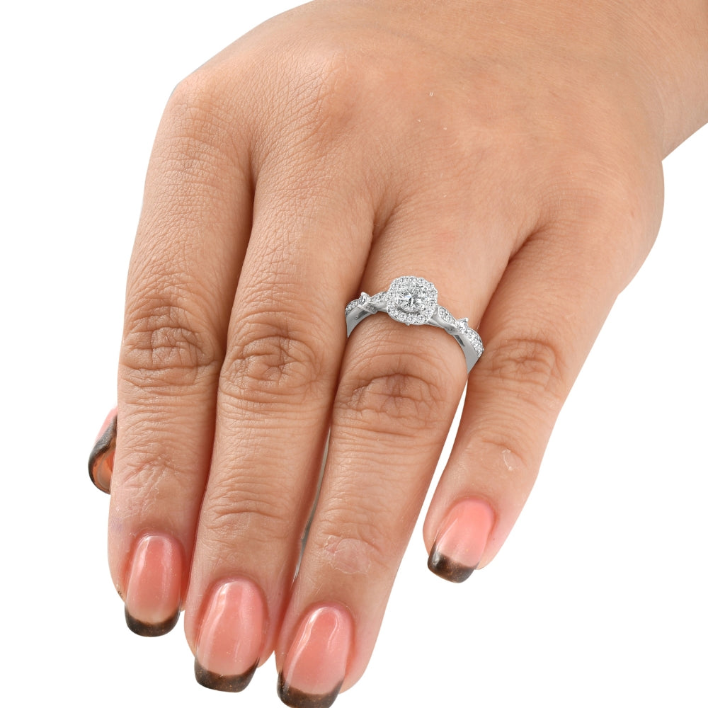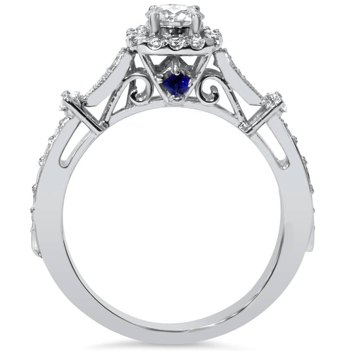 This Verona 1ct Cushion Halo Diamond & Blue Sapphire Engagement Ring by Pompeii3 combines a 1/2ct round brilliant cut center diamond with 30 accent diamonds and two beautiful blue sapphires, all set in solid 14k white gold. The cushion halo design enhances the diamond’s brilliance, while the blue sapphires add a unique touch of color.