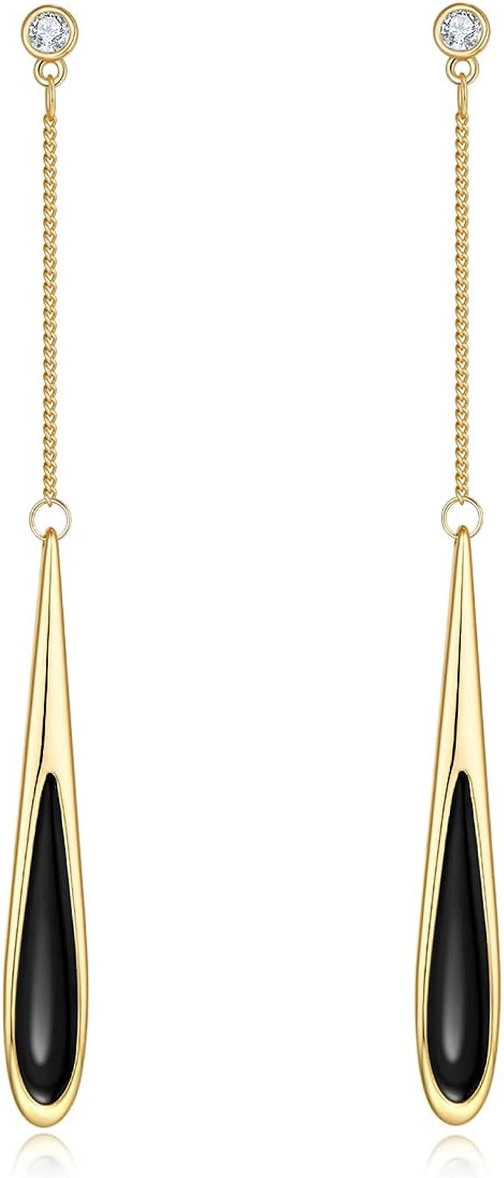 The 18K Gold Black Onyx Tear Drop Earrings by Liv Oliver combine modern and classic design with their luxurious 18K gold plating and bold black onyx stones. With a 3-inch drop, these earrings make a statement while maintaining timeless appeal. Whether for a glamorous evening out or a sophisticated daily look, the tear-drop design of the onyx, set in gold, enhances their beauty, ensuring they stand out in any setting.