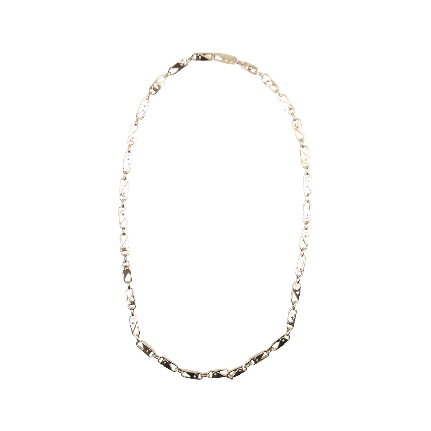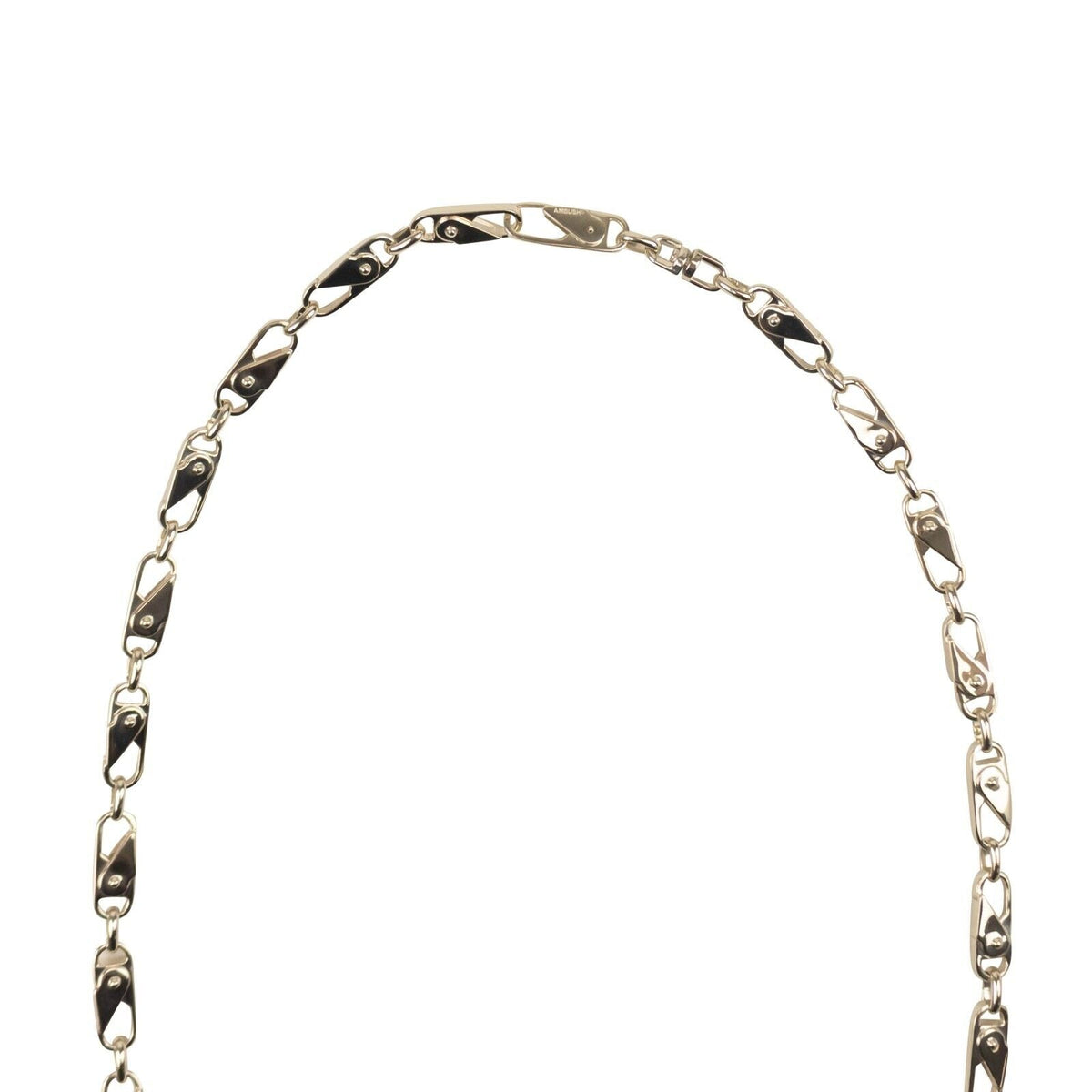 This Silver Metal Sling Snap Necklace by Ambush is a statement piece designed for those who appreciate unique and modern styles. Made entirely of metal, it features chain links and sling clasps that provide an edgy yet sophisticated look. Perfect for men, it adds a touch of boldness to any wardrobe.