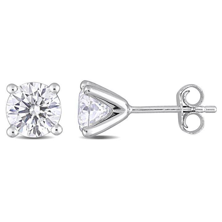 Made of sterling silver, these earrings feature two 6.5mm round-cut created white moissanite gemstones, with a total gemstone weight of 2 carats. Secured with butterfly backs.