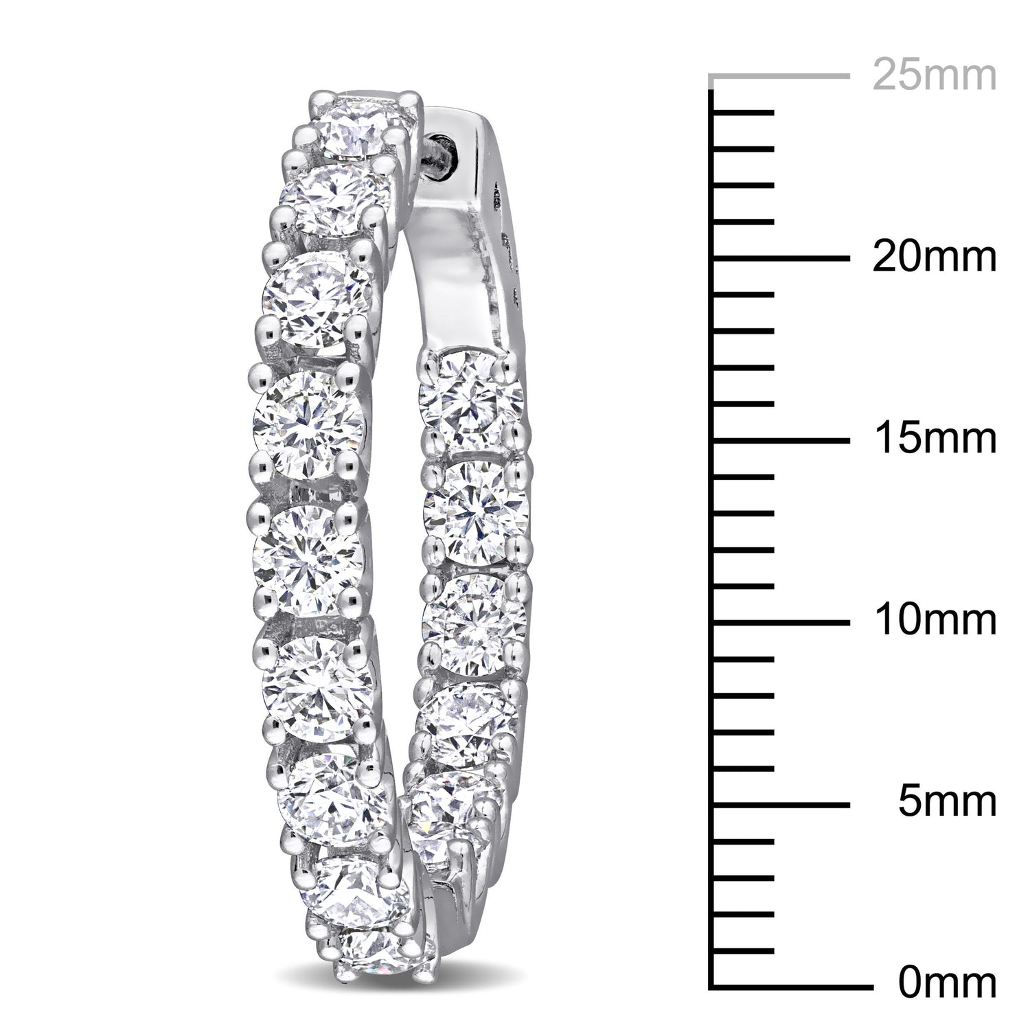 Sterling silver with 30 round prong-set created white moissanite gemstones, totaling 3 carats. Earring dimensions: 3.3mm wide x 24.8mm long x 26.7mm deep. Clip-back closure for secure fit.