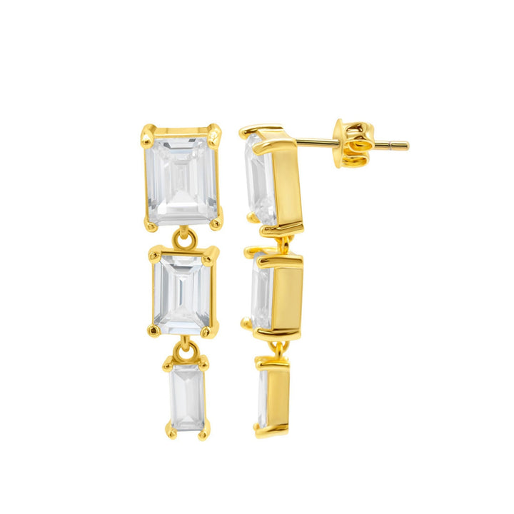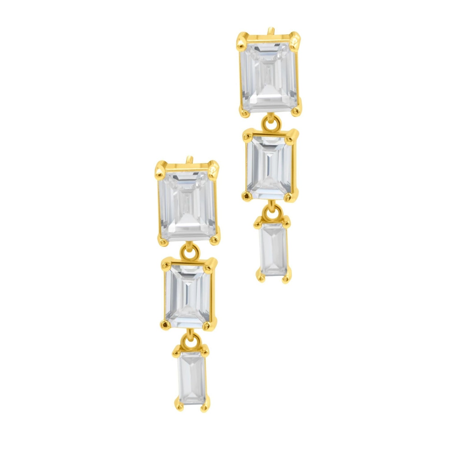 Crafted in 14K yellow gold-plated brass with crystal detailing. Measures 1.25 inches tall and 0.25 inches wide. Secured with post back closures.