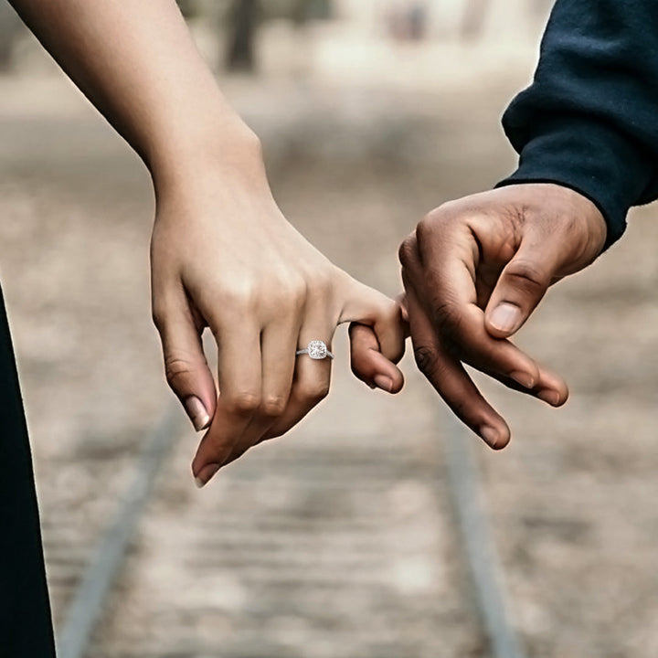 This Mimi & Max 2ct DEW Cushion Created Moissanite and 1/4ct TW Diamond Halo Engagement Ring in 14k White Gold is an exquisite representation of elegance and sparkle. The cushion-cut moissanite center stone is surrounded by a halo of round-cut diamonds, adding a breathtaking display of light and brilliance. This ring is perfect for marking a lifetime of love and commitment.