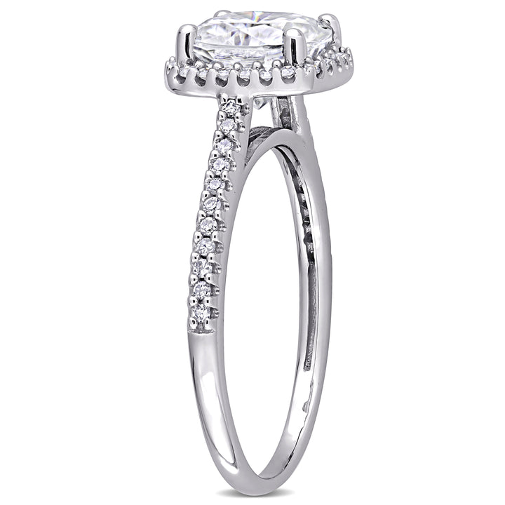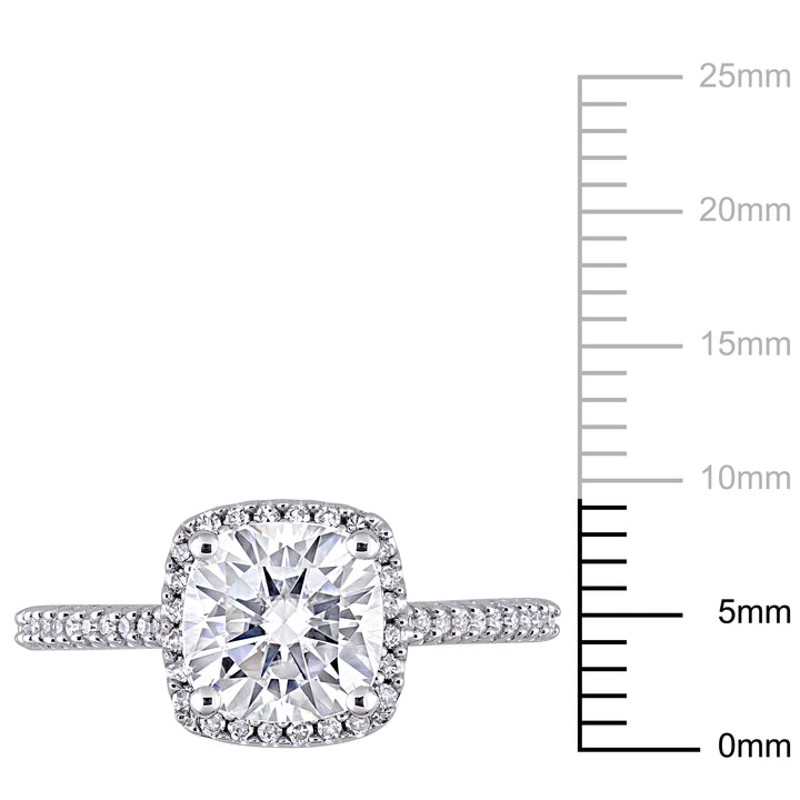 Crafted in 14k white gold with a 2 ct. created moissanite center stone and 1/4 ct. t.w. round diamonds. Ring setting dimensions: 8.1 mm wide x 6.9 mm high. Band width: 1.7 mm.