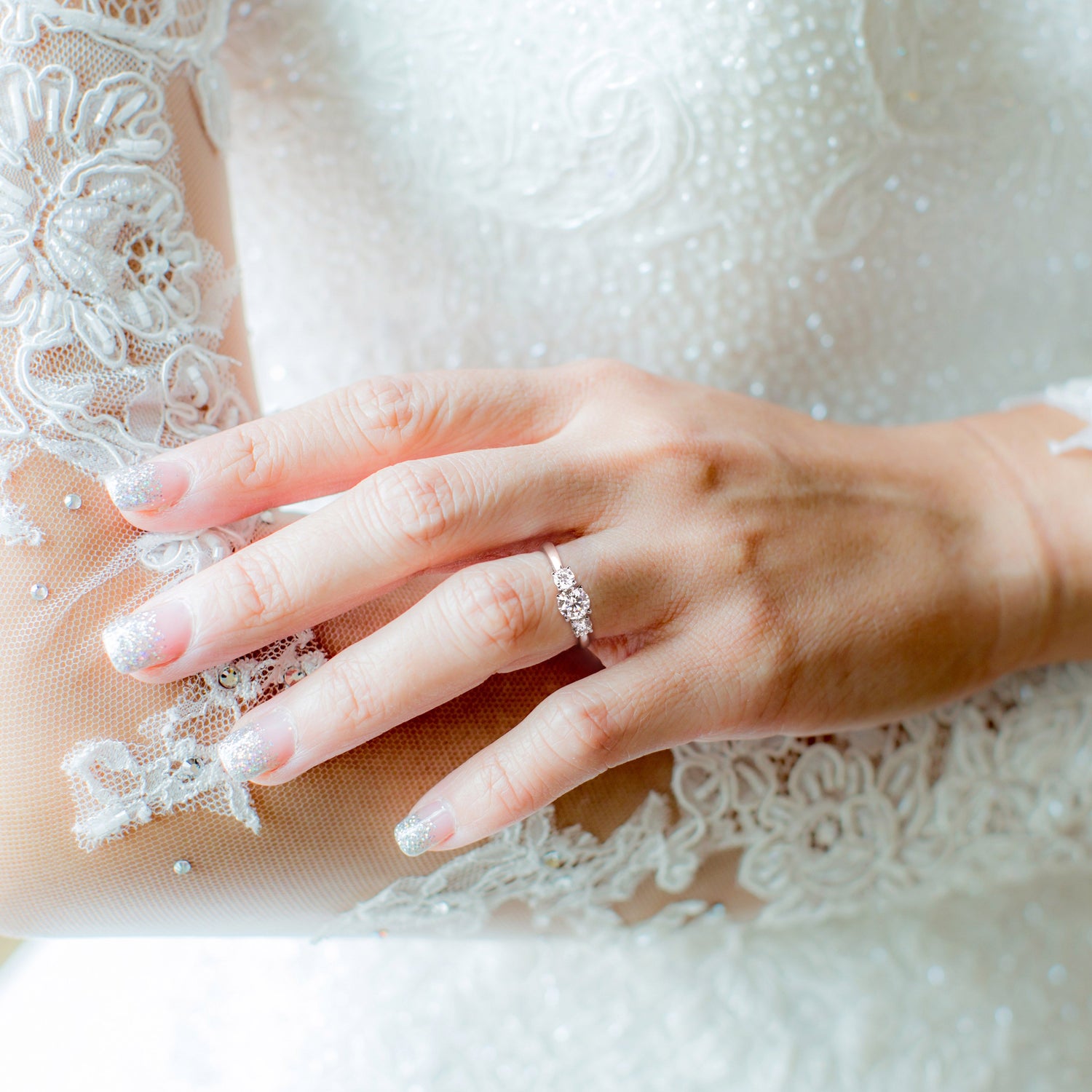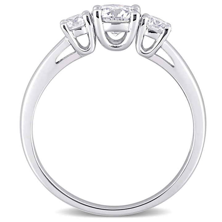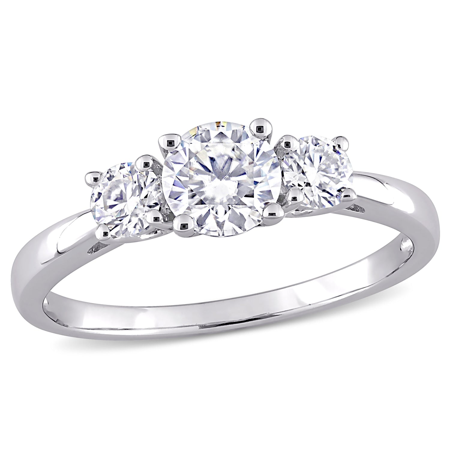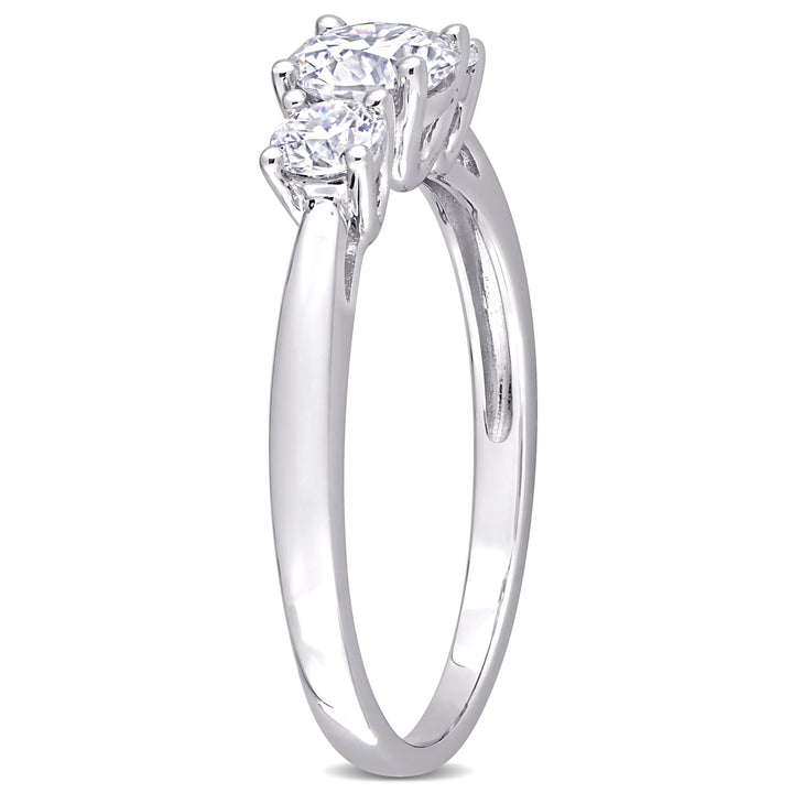 Sterling silver. 1.00 ct. total weight of created white moissanite. Three-stone prong setting. Band width: 1.6mm.