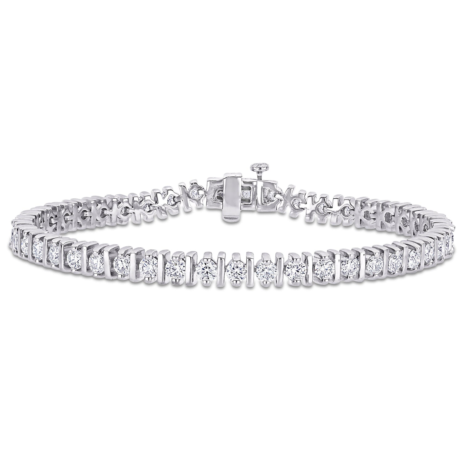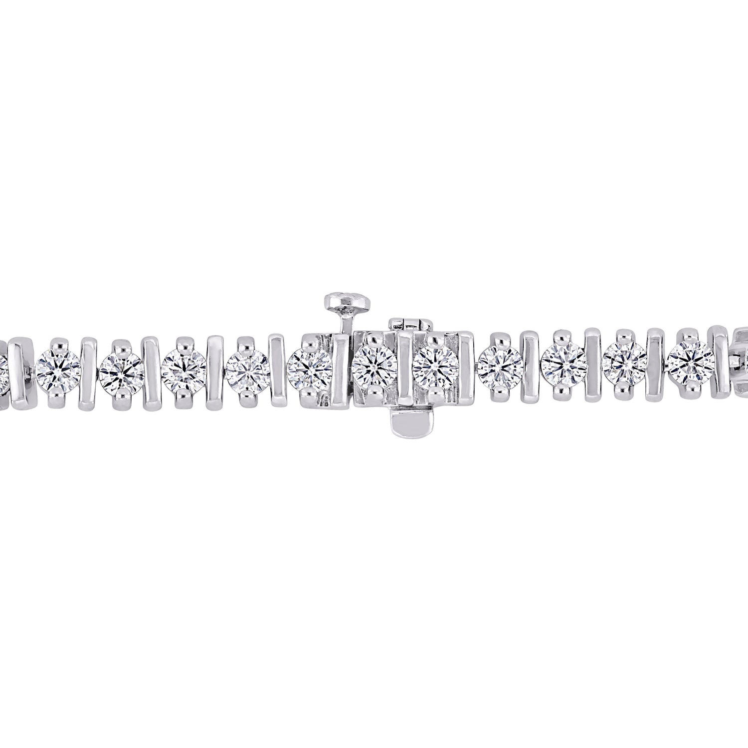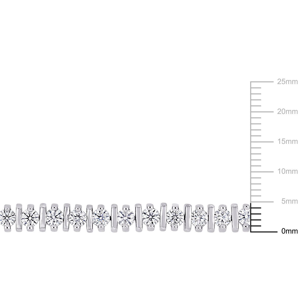 Crafted from sterling silver with 46 round-cut, prong-set created white moissanite gemstones (3mm). Bracelet length: 7.25 inches.