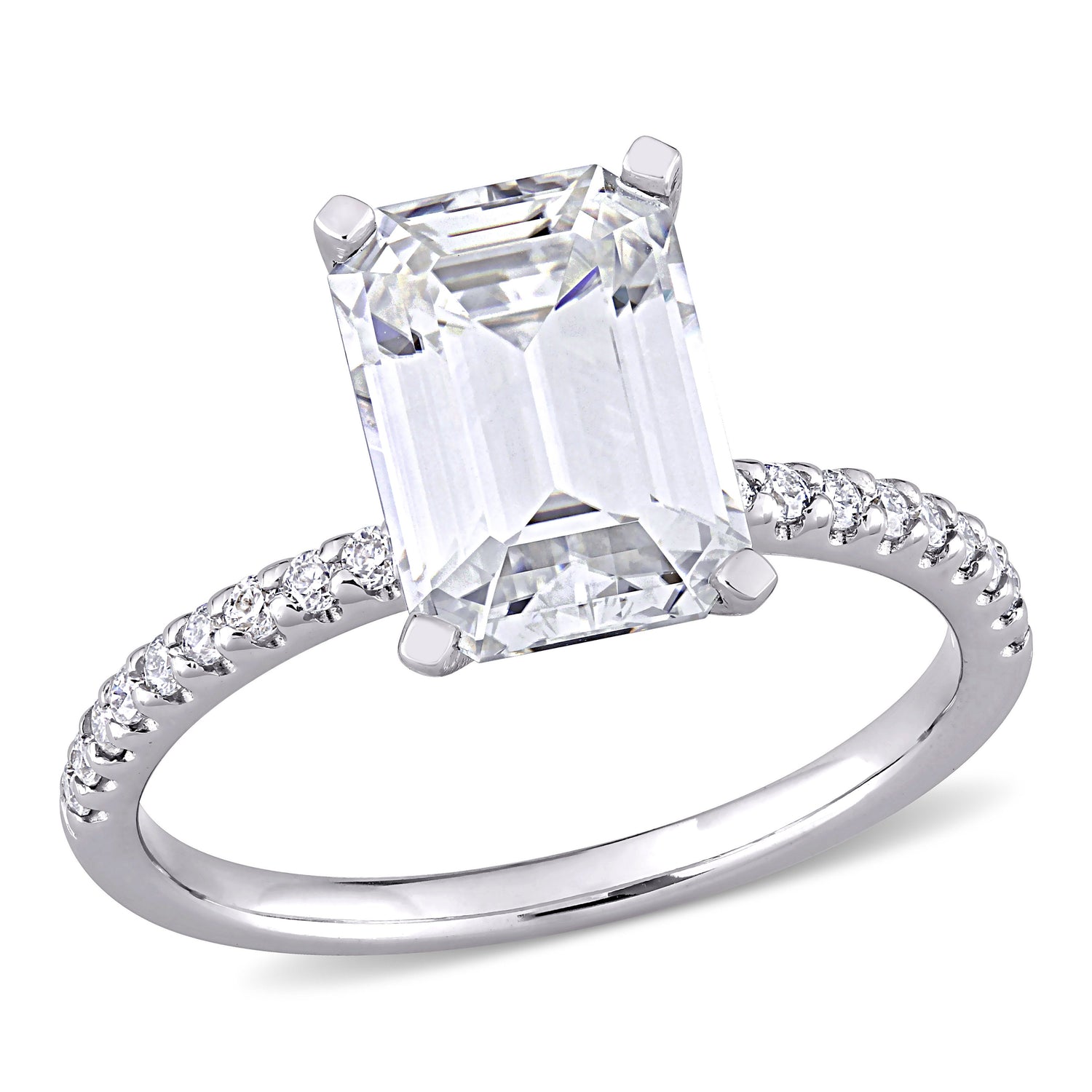 10k white gold, 3 carat emerald-cut created white moissanite (1 stone), 1/5 carat round created white moissanite (20 stones). High-polish finish. Ring setting dimensions: 10.5mm wide.