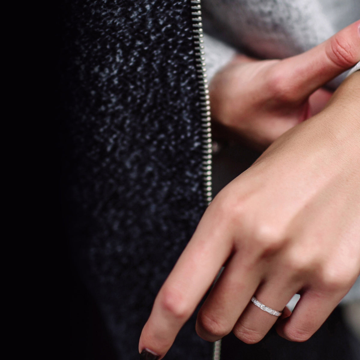 Made with created white moissanite, totaling 2/5 carats. Set in sterling silver. Band dimensions: 1.6 mm wide. Ring dimensions: 2.9 mm wide x 20.4 mm long x 2.8 mm high.