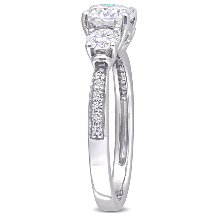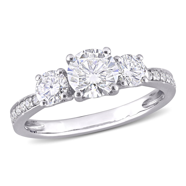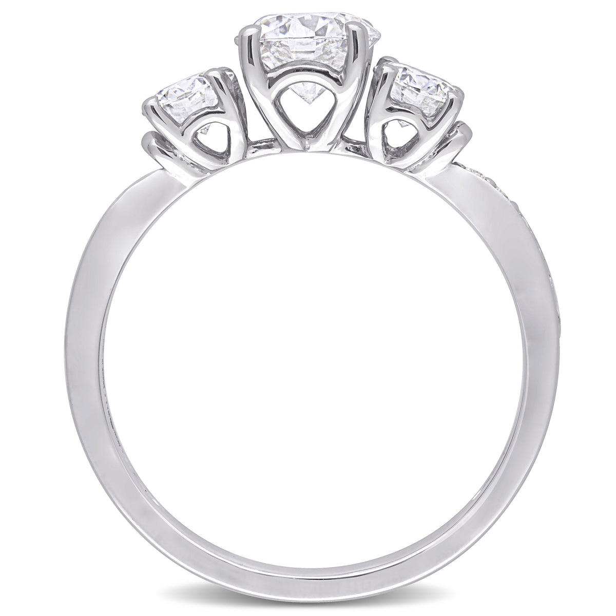 1 3/8 ct. t.w. created white moissanite (3 stones, round-cut), prong-set. 10k white gold with high-polish finish. Ring setting dimensions: 6.1mm wide x 20.6mm long x 5.9mm high. Band width: 2.2mm.