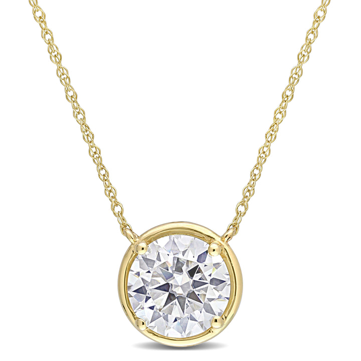 This Mimi & Max 2ct DEW Created Moissanite Circular Pendant exudes timeless elegance. The brilliant round-cut moissanite solitaire is prong-set in 10k yellow gold, suspended from a delicate rope chain. Its radiant sparkle and high-polish finish make it the perfect statement of sophistication.