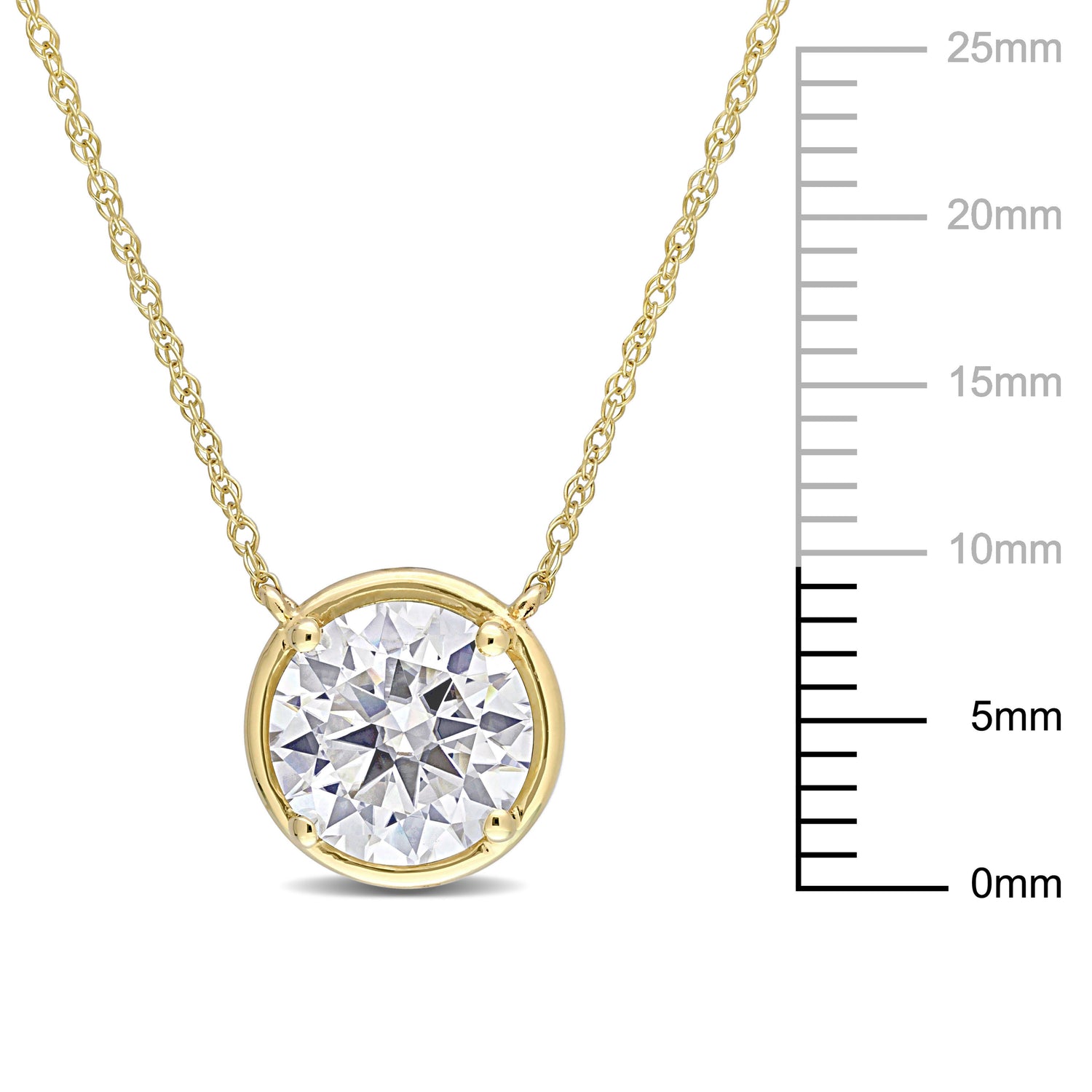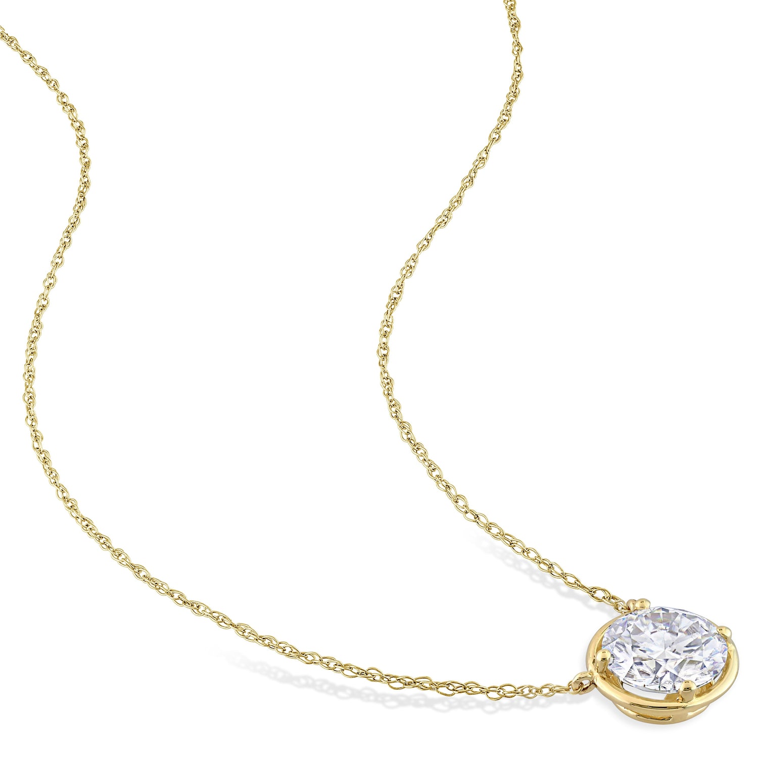 10k yellow gold. Created white moissanite (2 cttw, round-cut). 17-inch rope chain with spring ring clasp. Pendant dimensions: 9.8mm x 9.8mm.