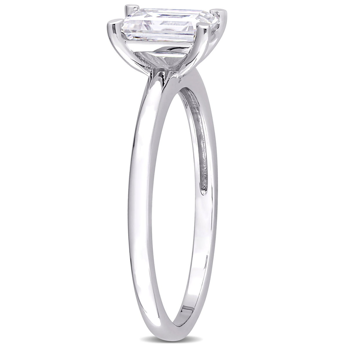 The engagement ring features a 1ct created white moissanite in an octagon cut, set in sterling silver. The band is polished, with a metal weight of 2.19 grams. The setting dimensions are 7.7mm wide x 20.5mm long x 5.8mm high.