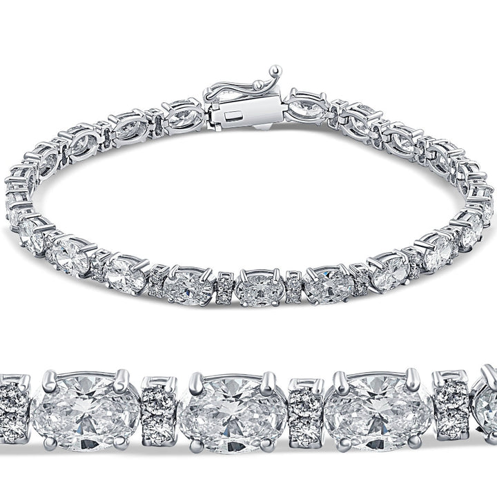 Made with 14k white gold, featuring 8 carats of oval and round lab-grown diamonds. Bracelet measures 7' and includes a secure double lock. Diamond clarity: VS.