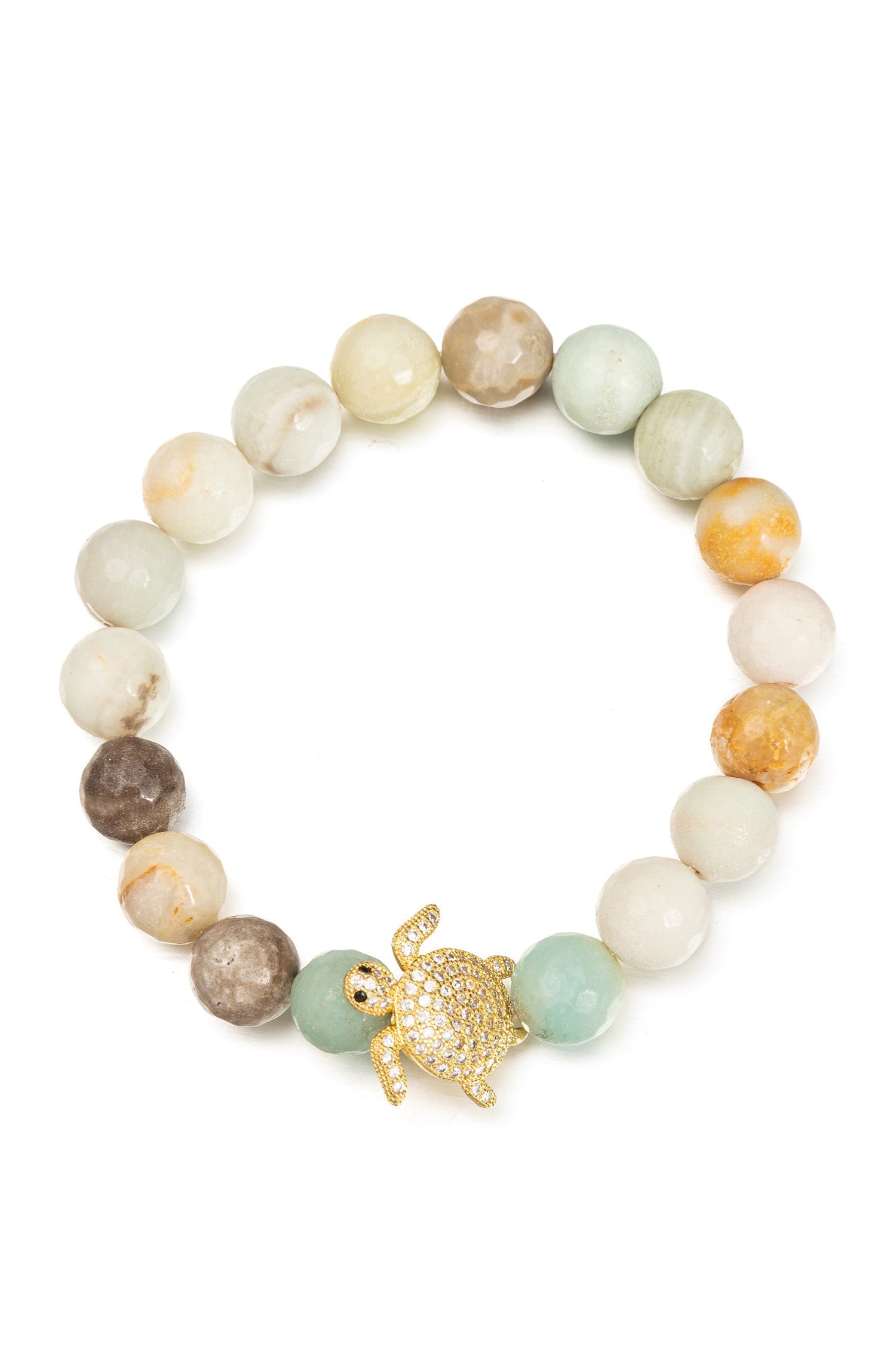 Made with natural amazonite beads and a CZ-encrusted turtle center charm. Stretch band closure for easy wear.