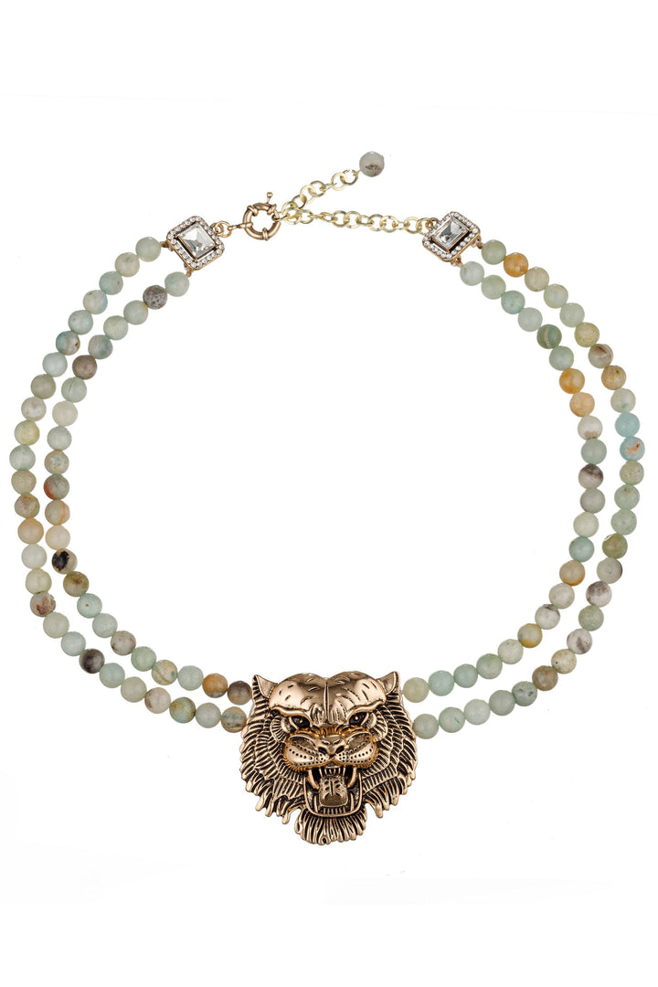 This Asal Amazonite Tiger Statement Beaded Necklace by Eye Candy LA is a bold and stylish accessory that combines amazonite beads with a tiger-shaped pendant. The necklace exudes both elegance and fun, making it perfect for anyone looking to make a statement.