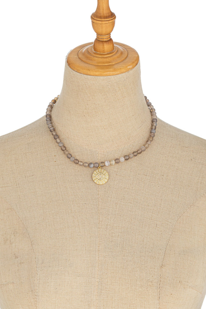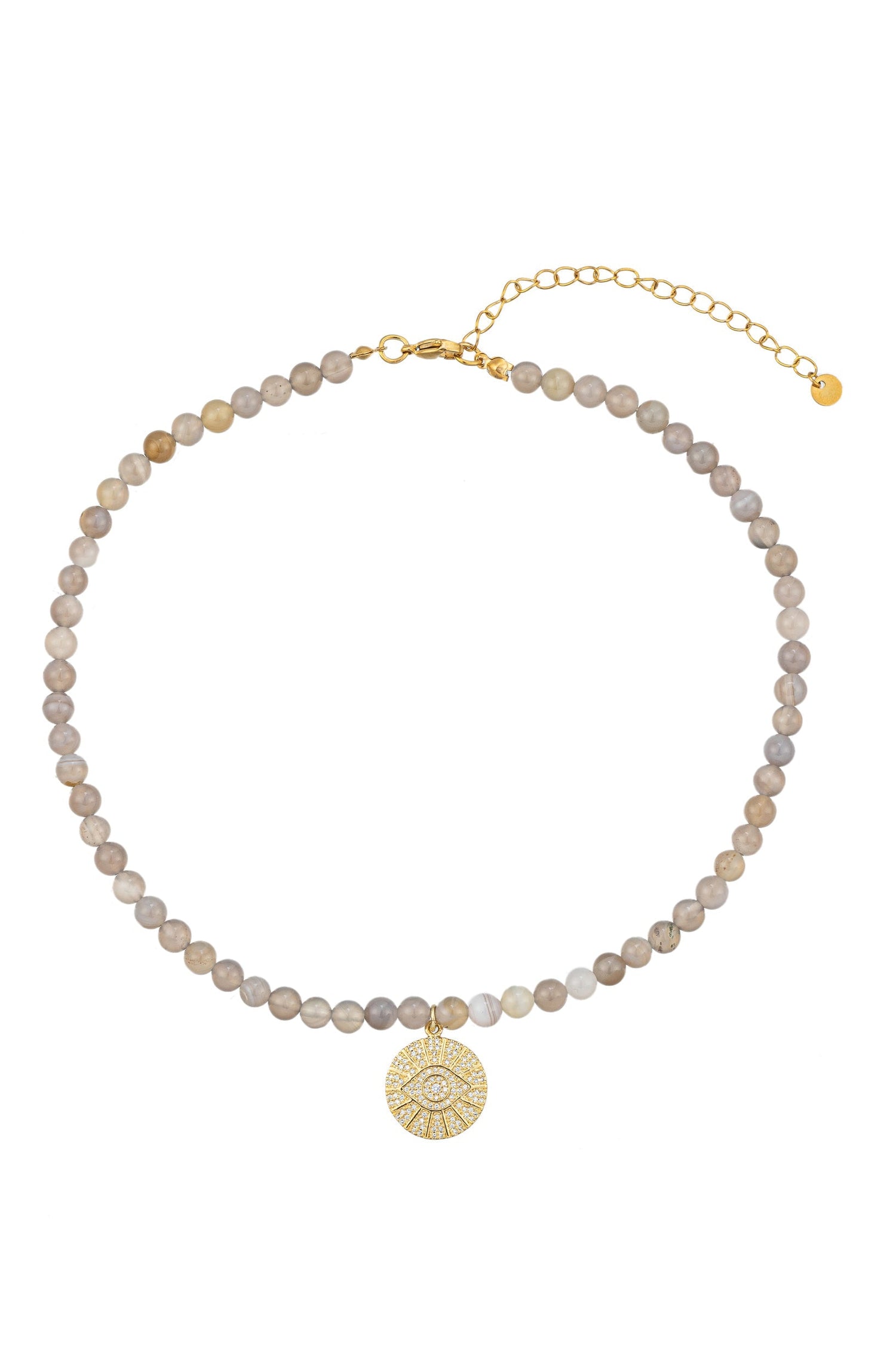 This Gia Eye & Heart Necklace by Eye Candy LA merges bold design with meaningful symbolism. Featuring beige agate beads paired with a striking brass pendant, the heart-shaped motif is embellished with an eye, making it a powerful symbol of protection. This necklace is not only a fashion statement but also a protective charm. The agate stones add a natural, earthy element, while the brass and CZ crystals enhance its elegance, making it perfect for any occasion.