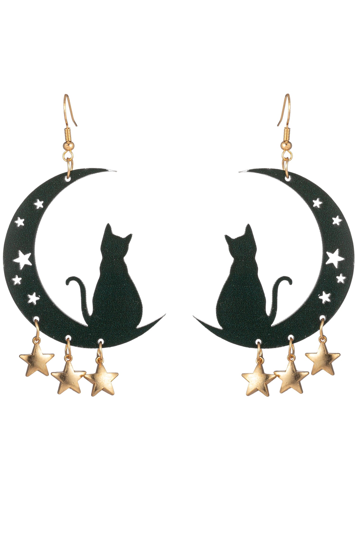 These Black Cat Mood Drop Earrings by Eye Candy LA are a playful and stylish way to make a statement. Made of glossy black acrylic and gold alloy, these earrings feature a cute black cat perched among stars and a moon. The added gold star charms enhance their whimsical design, making them the perfect accessory for a fun, fashion-forward look. These drop earrings are sure to catch the eye and add an element of charm to any outfit. Ideal for cat lovers or anyone seeking a unique and delightful piece of jewelry.