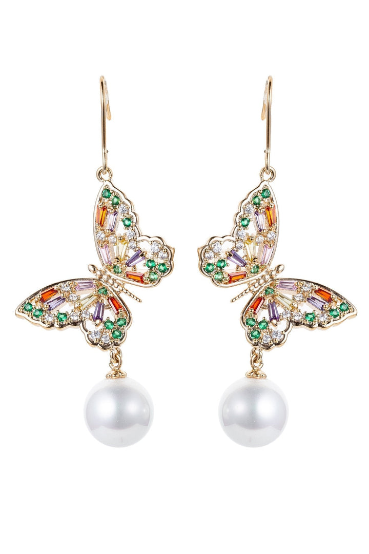 These Papillon Earrings by Eye Candy LA beautifully capture the graceful essence of a butterfly, adorned with CZ crystals and hanging shell pearls. Symbolizing transformation and freedom, these earrings add a touch of delicate elegance to any outfit, making them perfect for a special occasion or a chic everyday look.