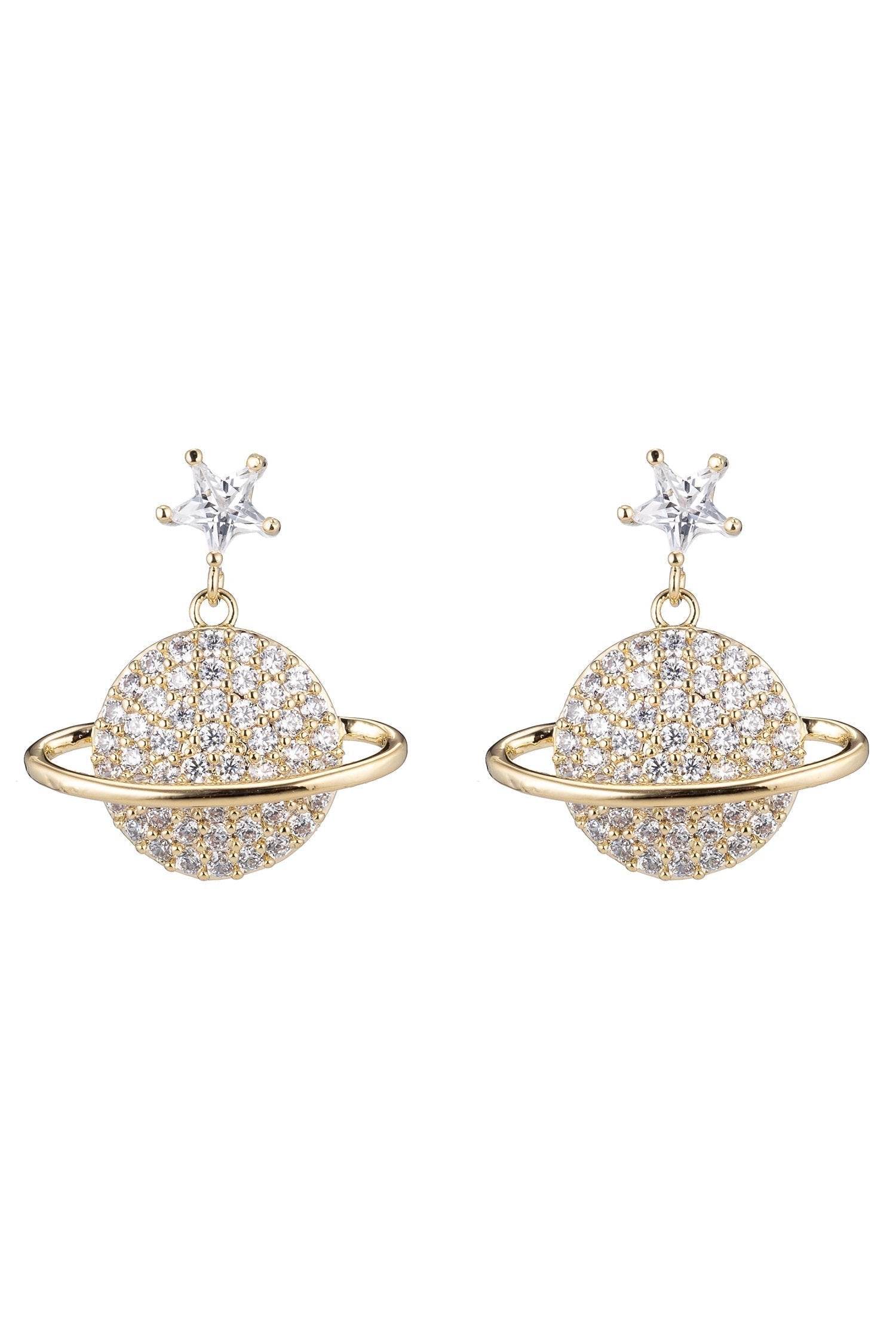 The Saturn Earrings in Gold by Eye Candy LA feature CZ crystals set in a gold-toned brass design, offering a sparkly, intergalactic-inspired look. These earrings, with a push-back closure, add a playful touch to your accessory collection. At approximately 0.5' in length, these earrings are ideal for those looking to add a bit of flair to their everyday wear.