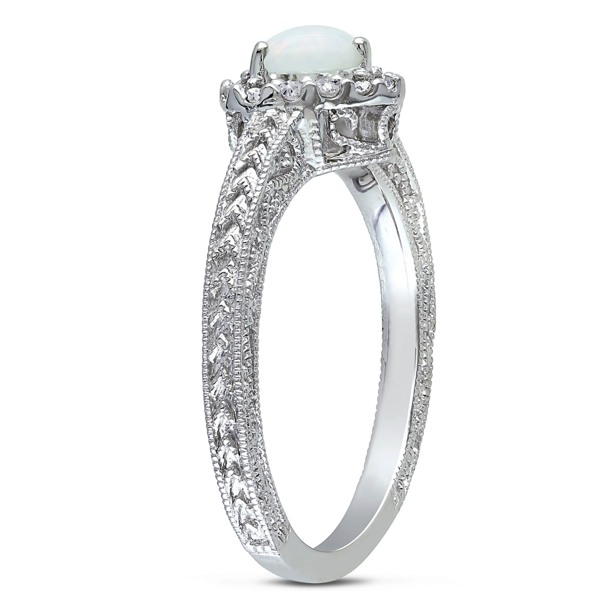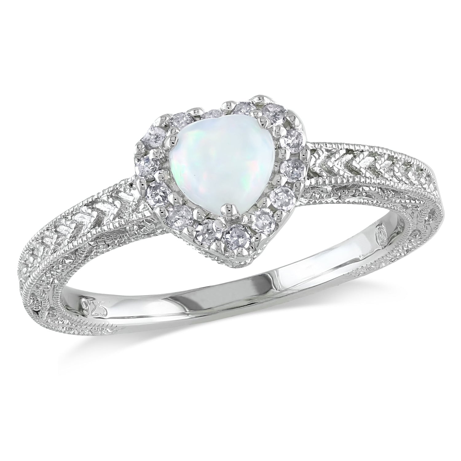 Crafted in sterling silver, featuring a 5mm heart-cut opal (1/3 ct.) and 14 round-cut white diamonds (1/6 ct. t.w.) in H-I color, I2-I3 clarity. Textured finish. Ring dimensions: 21.6 mm wide x 8.1 mm long x 6.5 mm high. Band width: 1.7 mm.