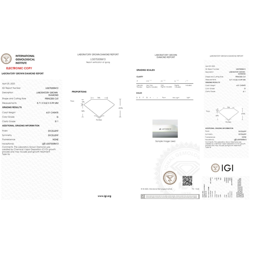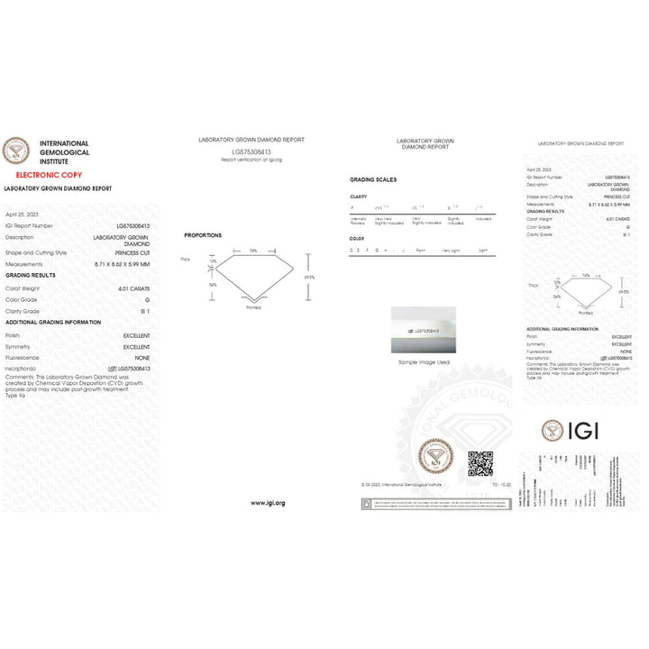 Features a 2.80ct princess cut lab-grown diamond, prong-set in 14k white gold. Total diamond weight: 4.59ct. Finger size: 7.5 only. IGI certified diamond.