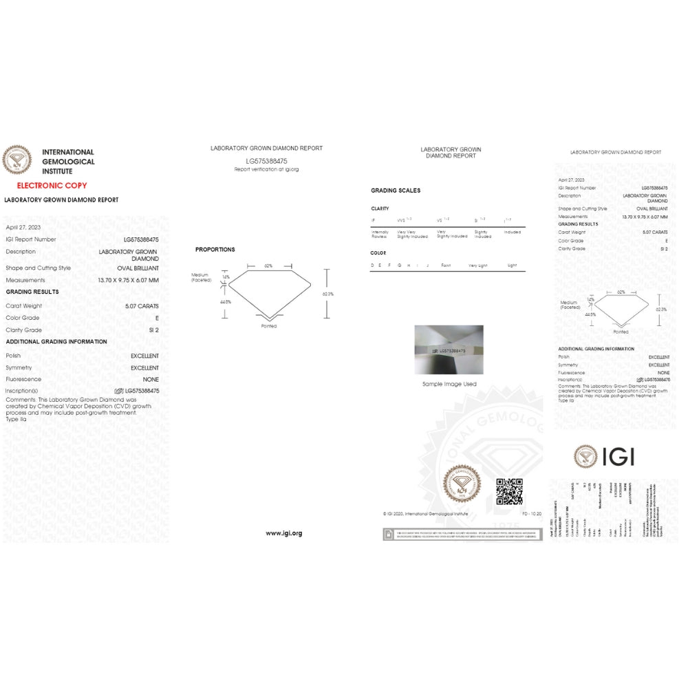 Crafted from 14k yellow gold with a 5.07ct oval cut lab-grown diamond. Diamond clarity: VS2, color: H-I. IGI certified.