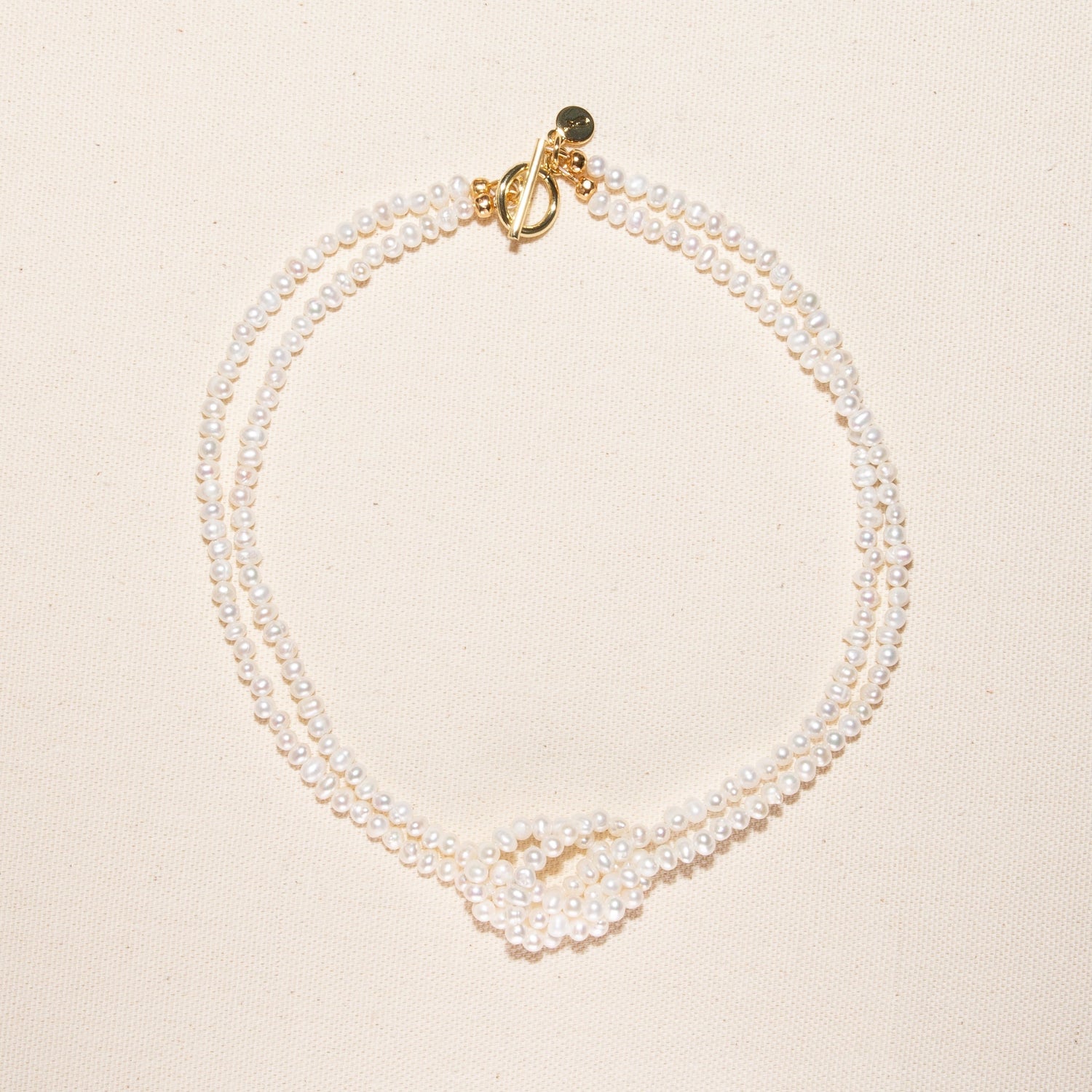 Crafted with freshwater pearls and 18K gold-plated clasps and findings. Necklace length: 15 inches with knot, 17 inches without knot.