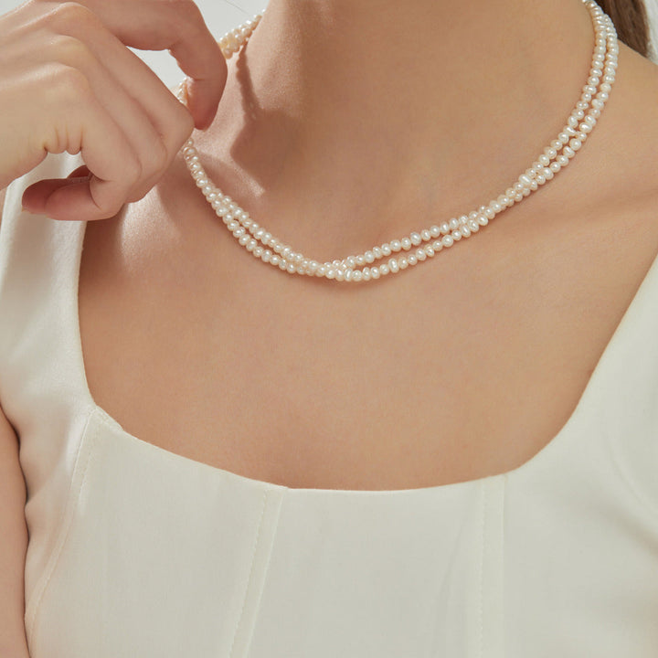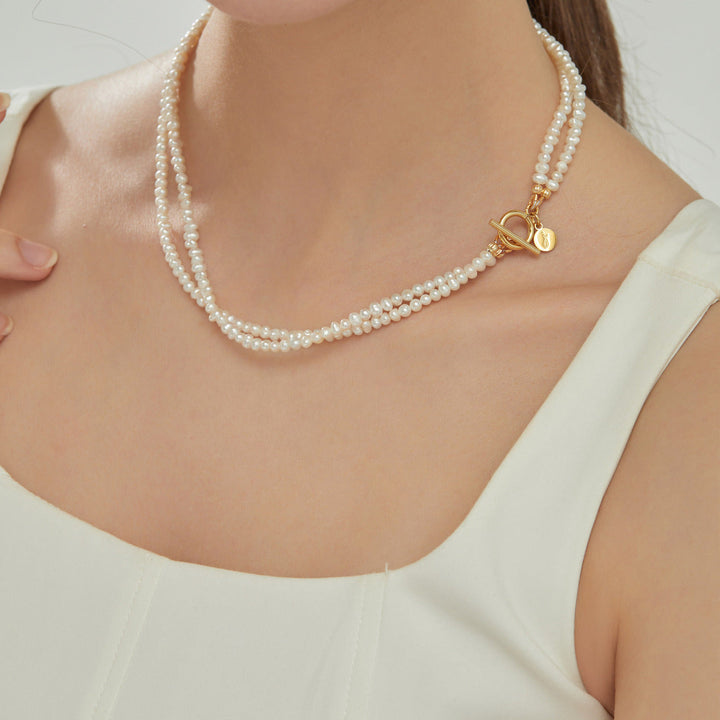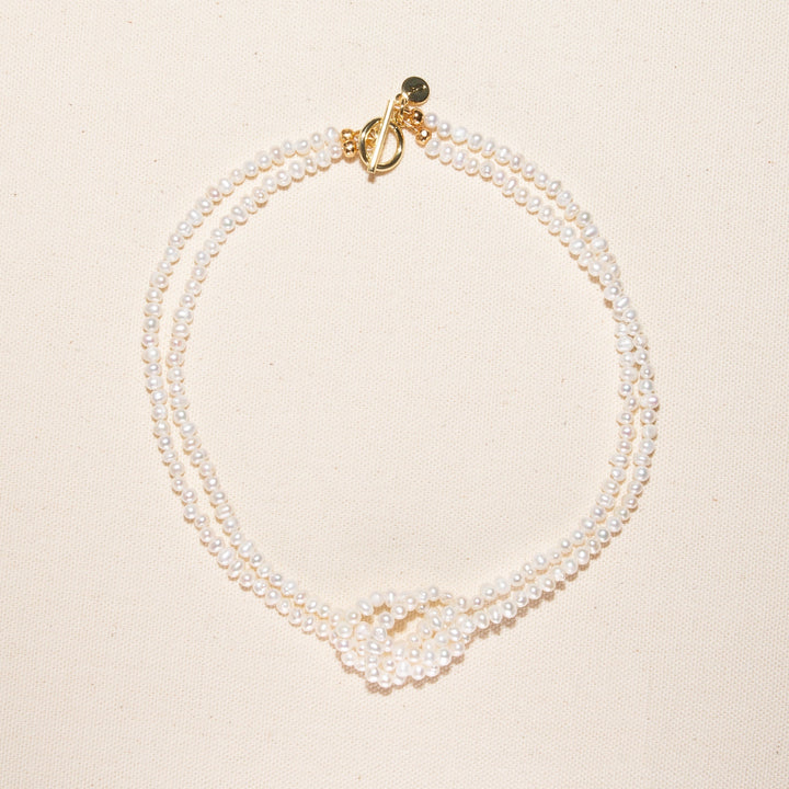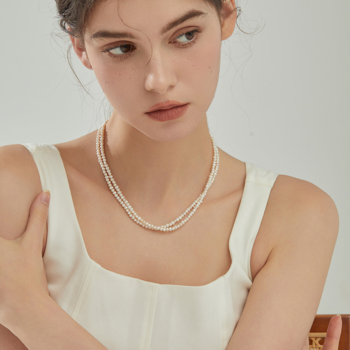 This Cece Double Layer Pearl Necklace by Joey Baby is a timeless and versatile piece that combines the elegance of freshwater pearls with the sophistication of 18K gold-plated findings. The double-layer design, with its unique knot detail that can be untied and retied, offers endless styling options. Whether paired with casual or business attire, this necklace exudes understated luxury. Perfect for layering, it will complement any look with its classic charm.