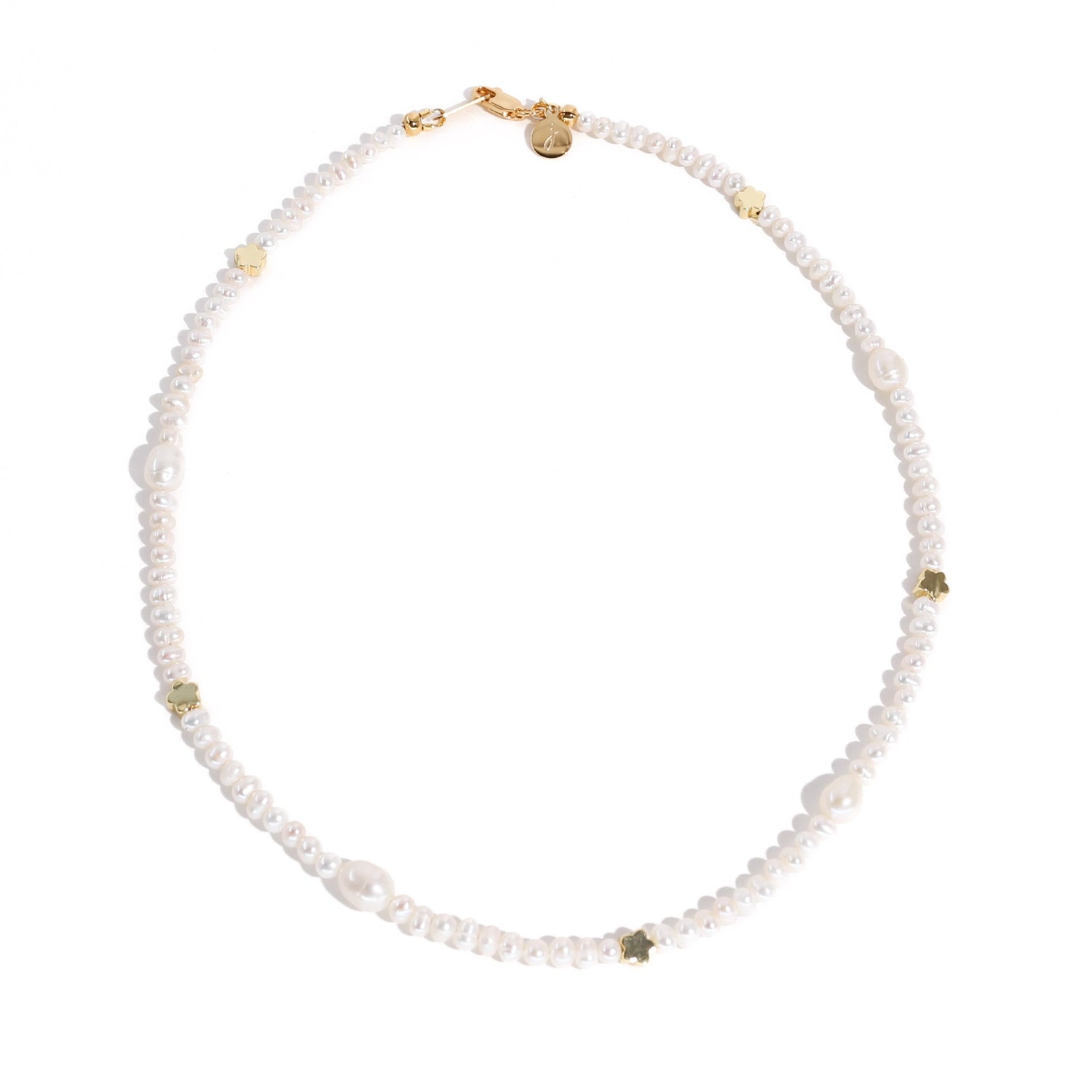 This Aubrey Dainty Pearl Necklace by Joey Baby is a chic and sophisticated piece that combines real freshwater pearls with intricate 18K gold-plated flower beads. Designed as a showstopper, the necklace is available in three lengths, making it a versatile addition to any jewelry collection. Perfect for special occasions or as a birthstone piece, this necklace adds elegance and charm to your look, transforming any moment into a red-carpet event.