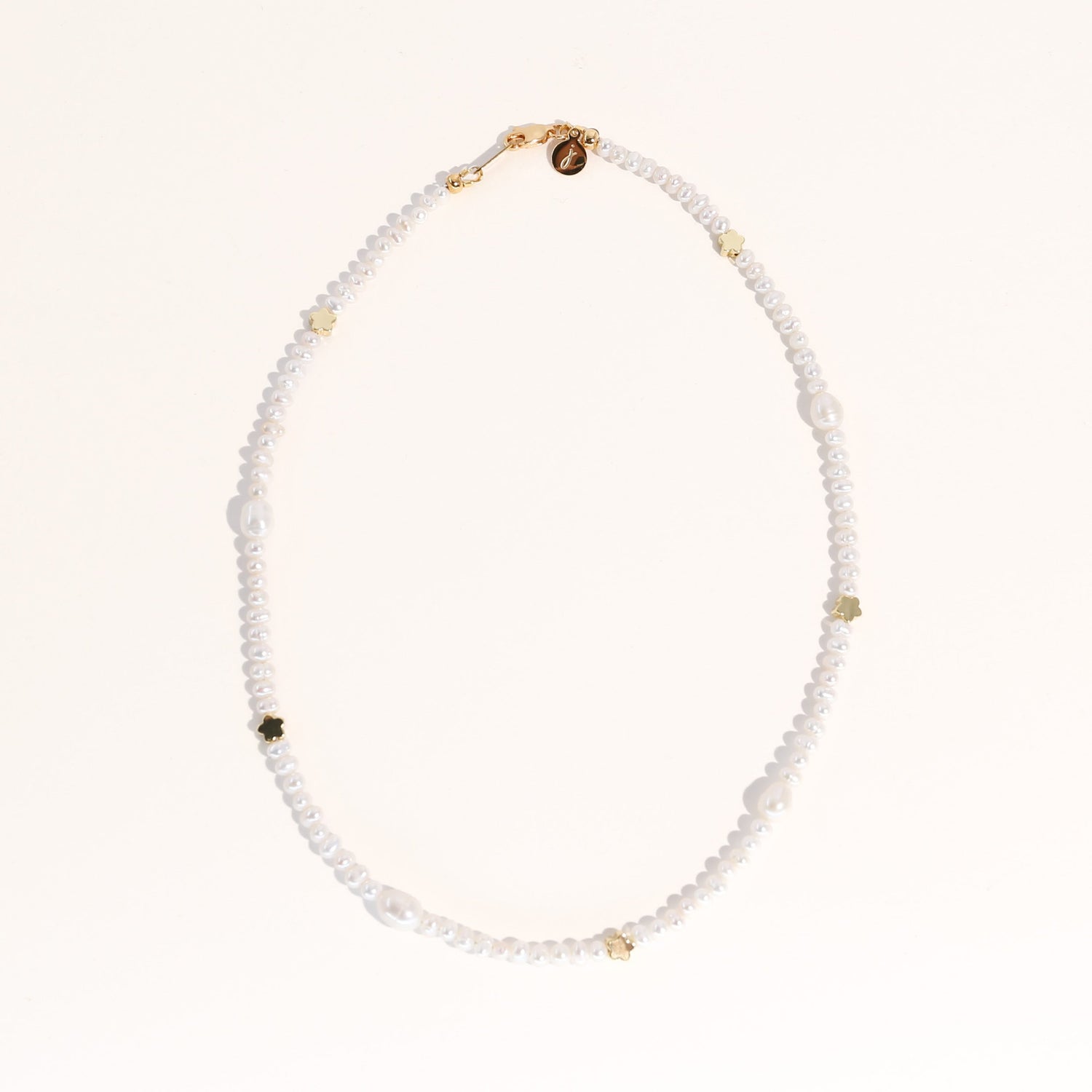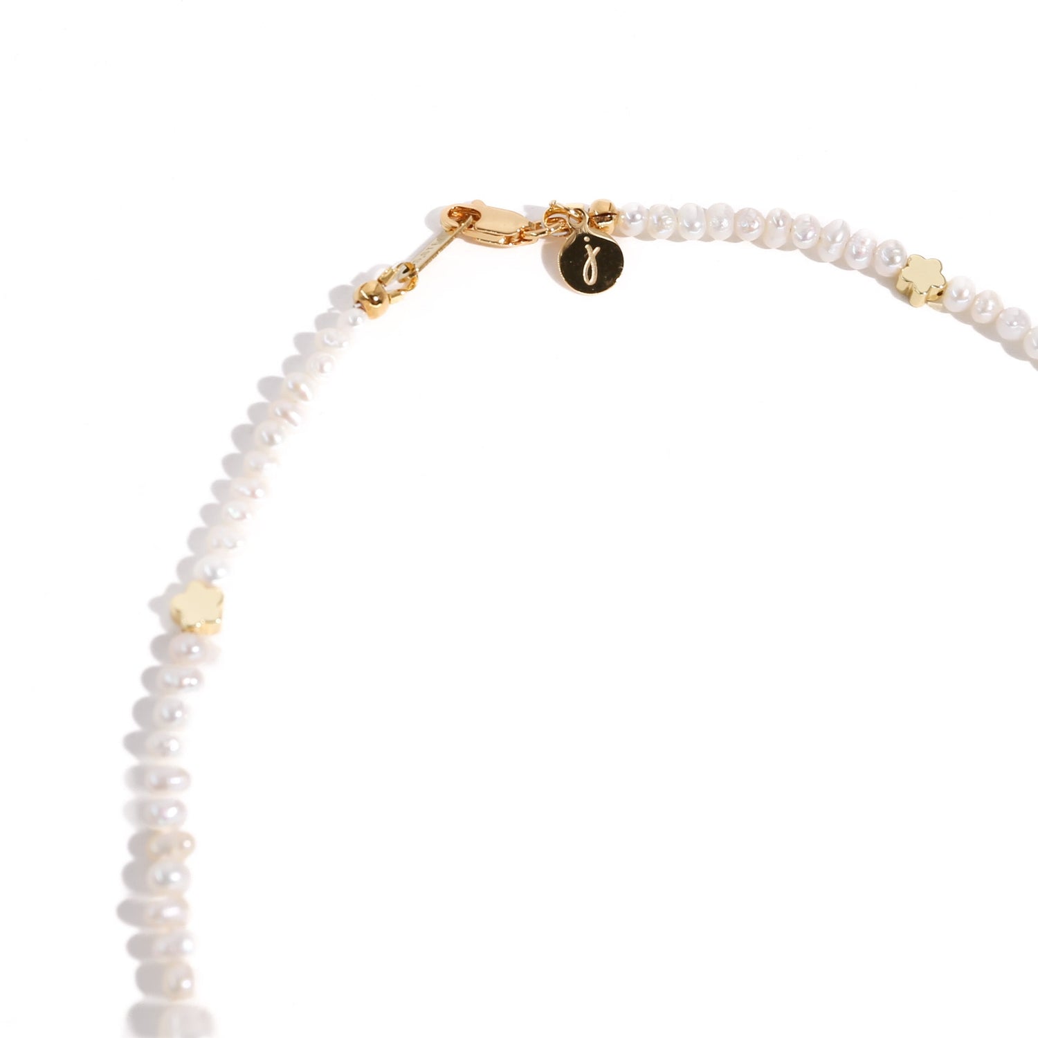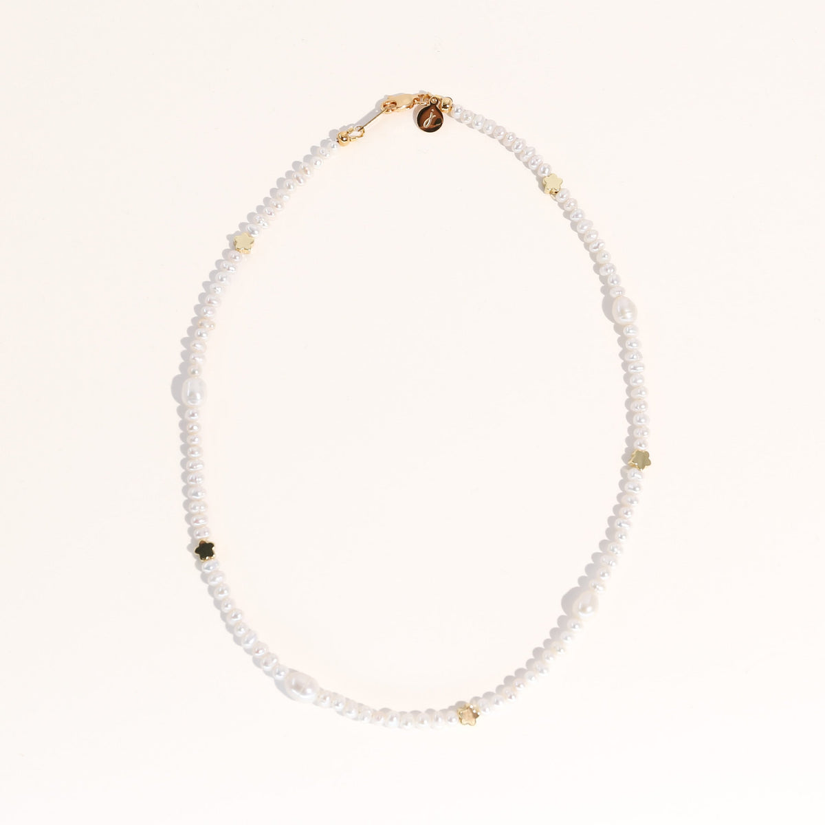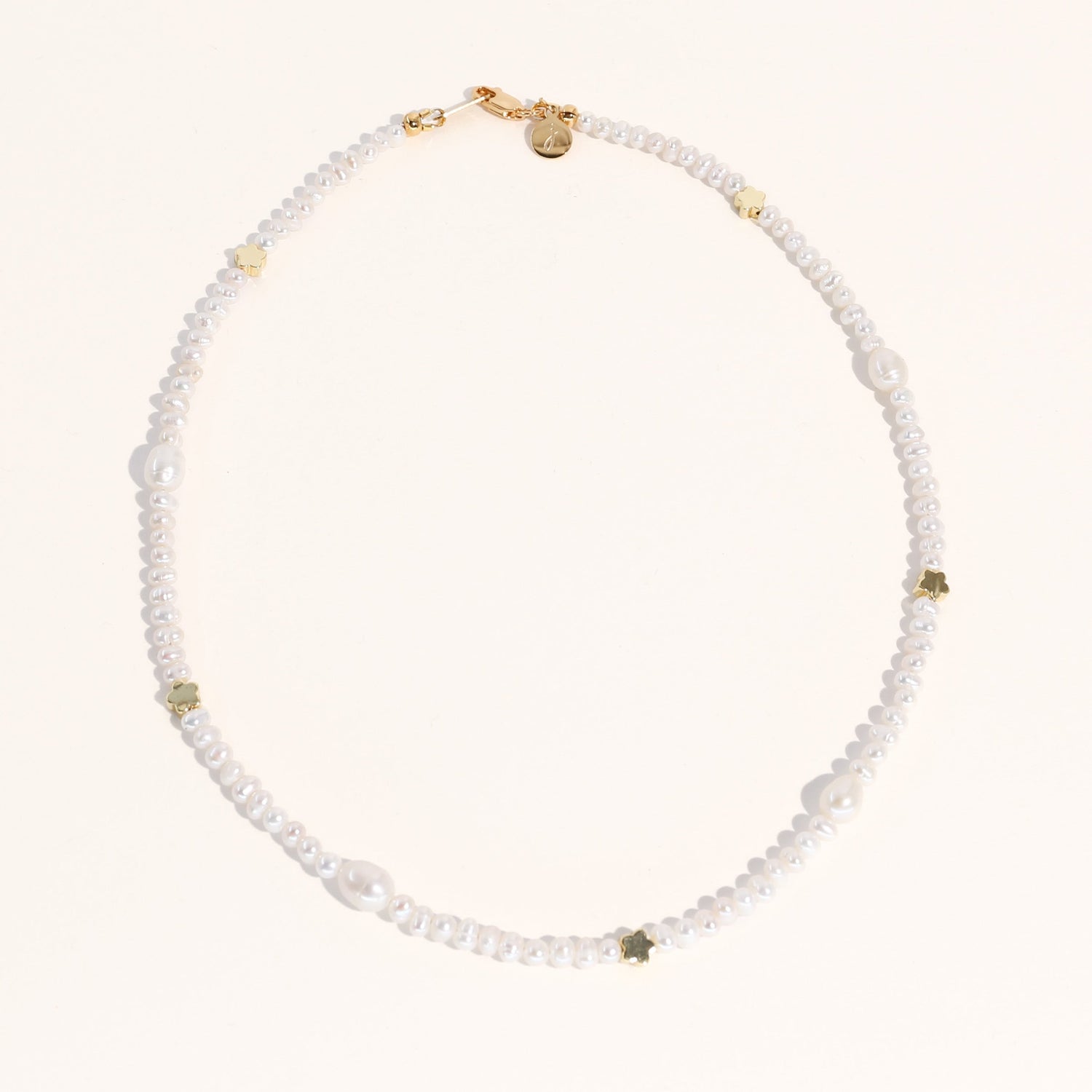 Made with 18K gold-plated freshwater pearls and 18K gold-plated flower beads. Necklace lengths: 16", 18", and 20". Stainless steel clasp.