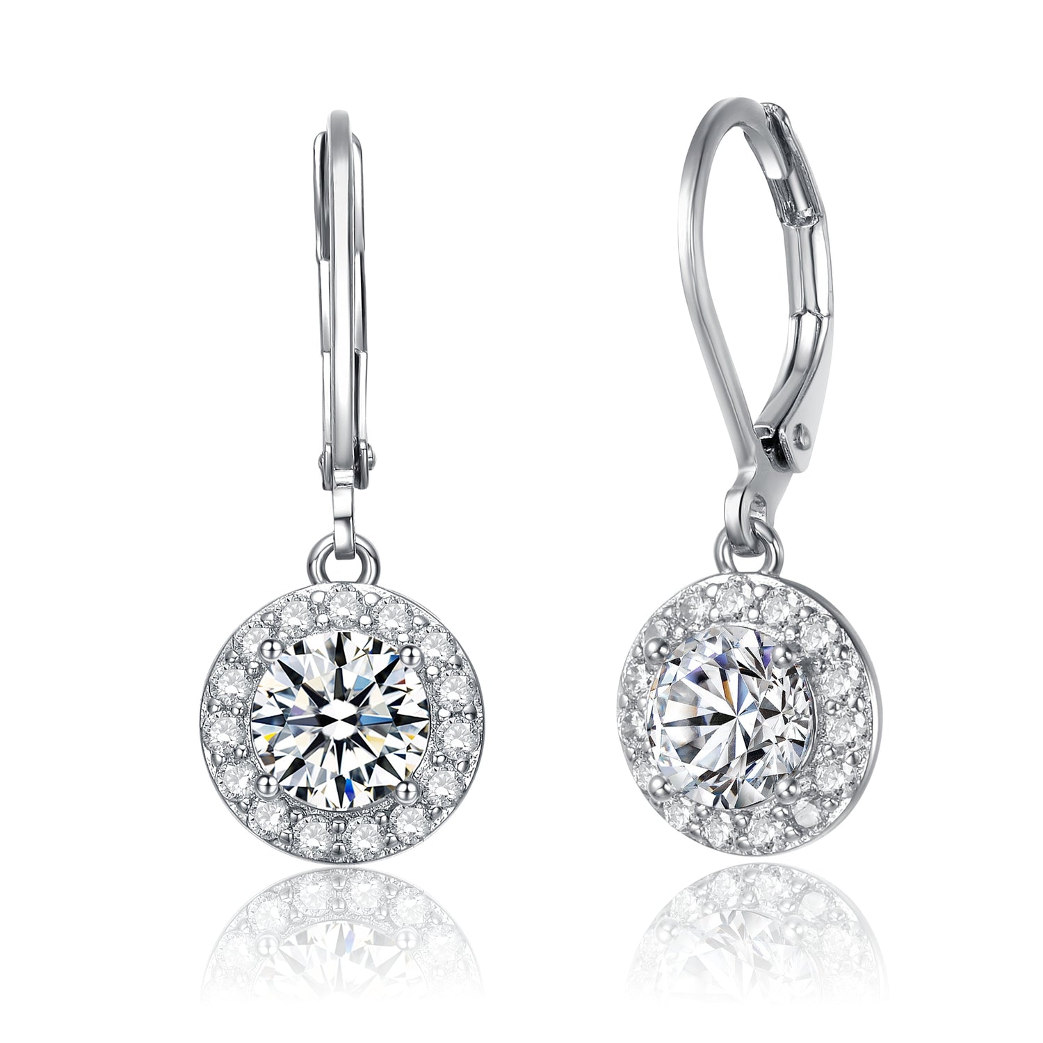 Sterling Silver White Gold Plating with Clear Cubic Zirconia Halo Drop Dangle Earrings