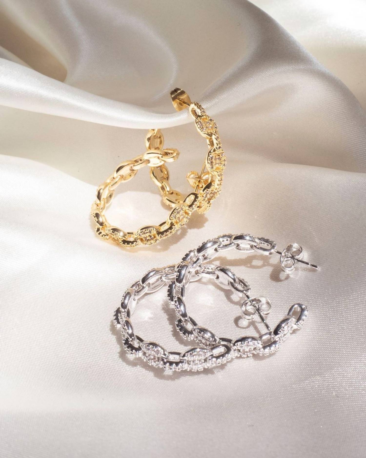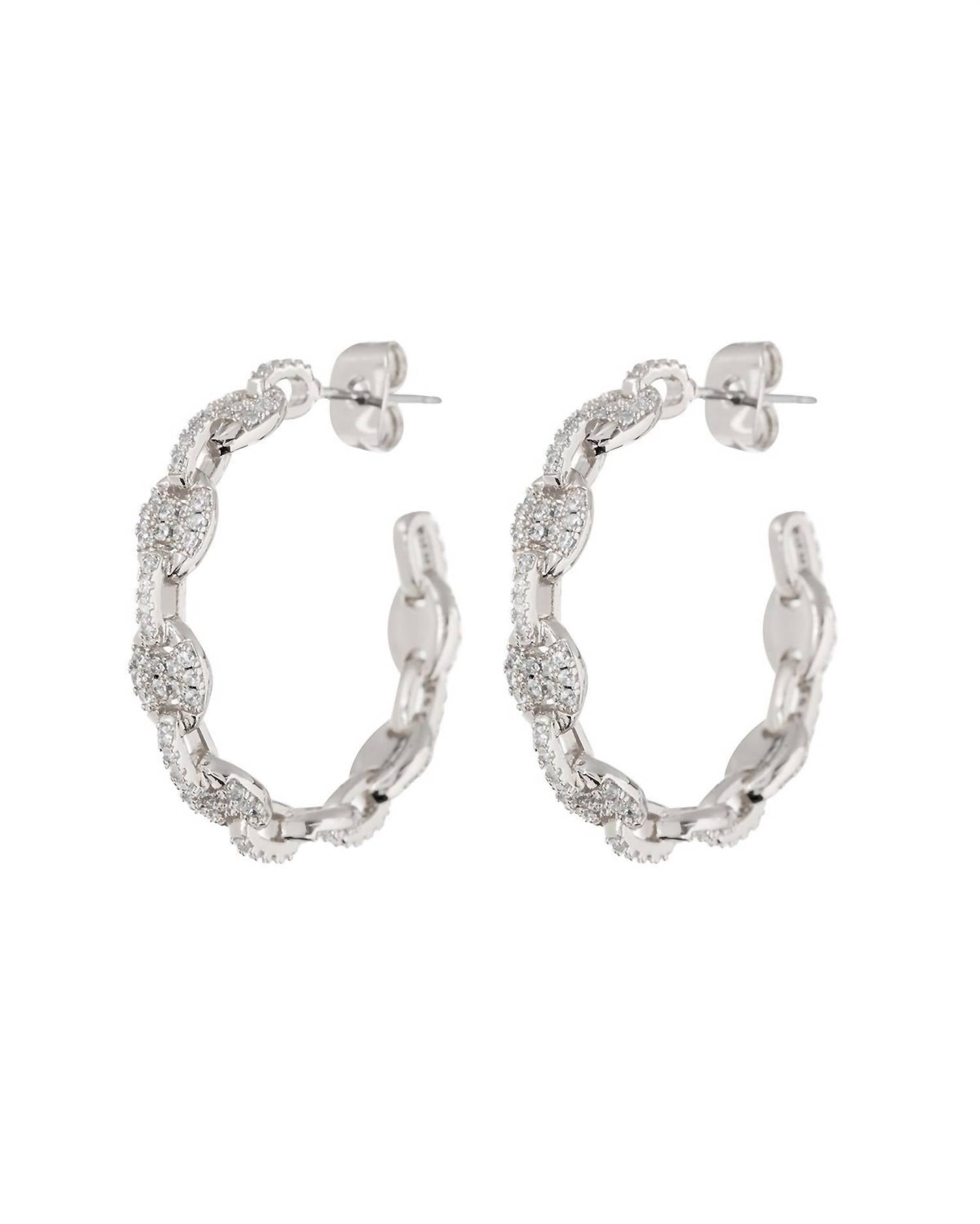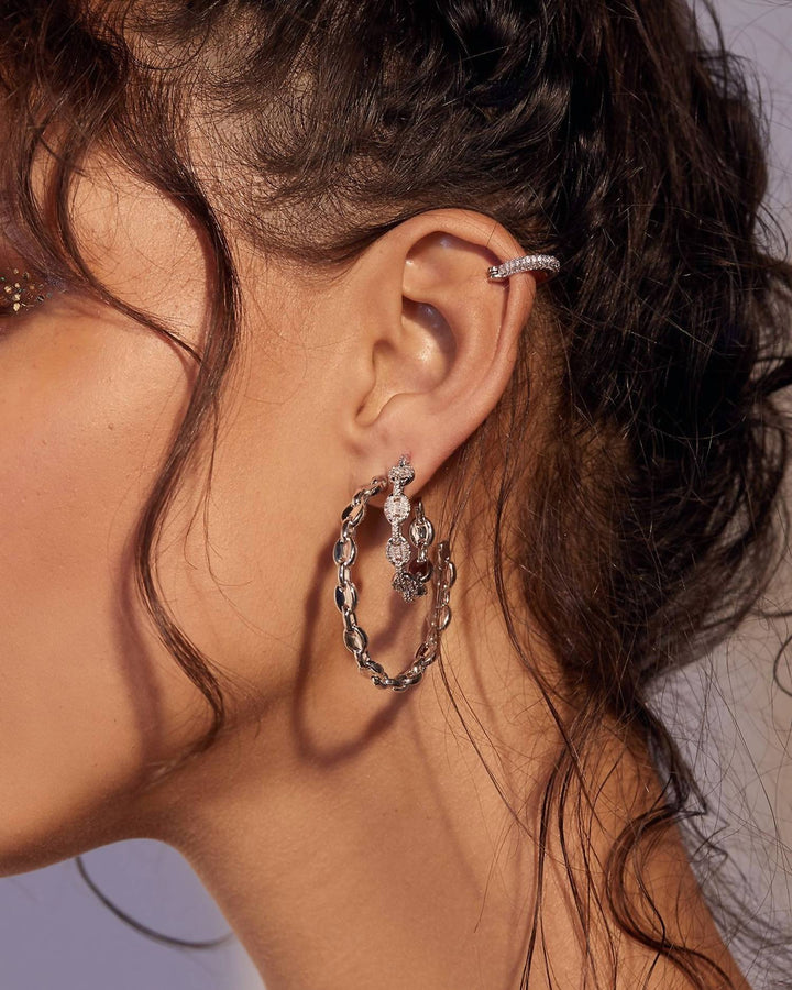 The Pavé Mariner Hoop Earrings in Silver by Luv Aj offer a modern twist on a classic hoop. With a sleek mariner-link design adorned with sparkling cubic zirconia, these earrings are an elegant yet edgy choice for any occasion.
