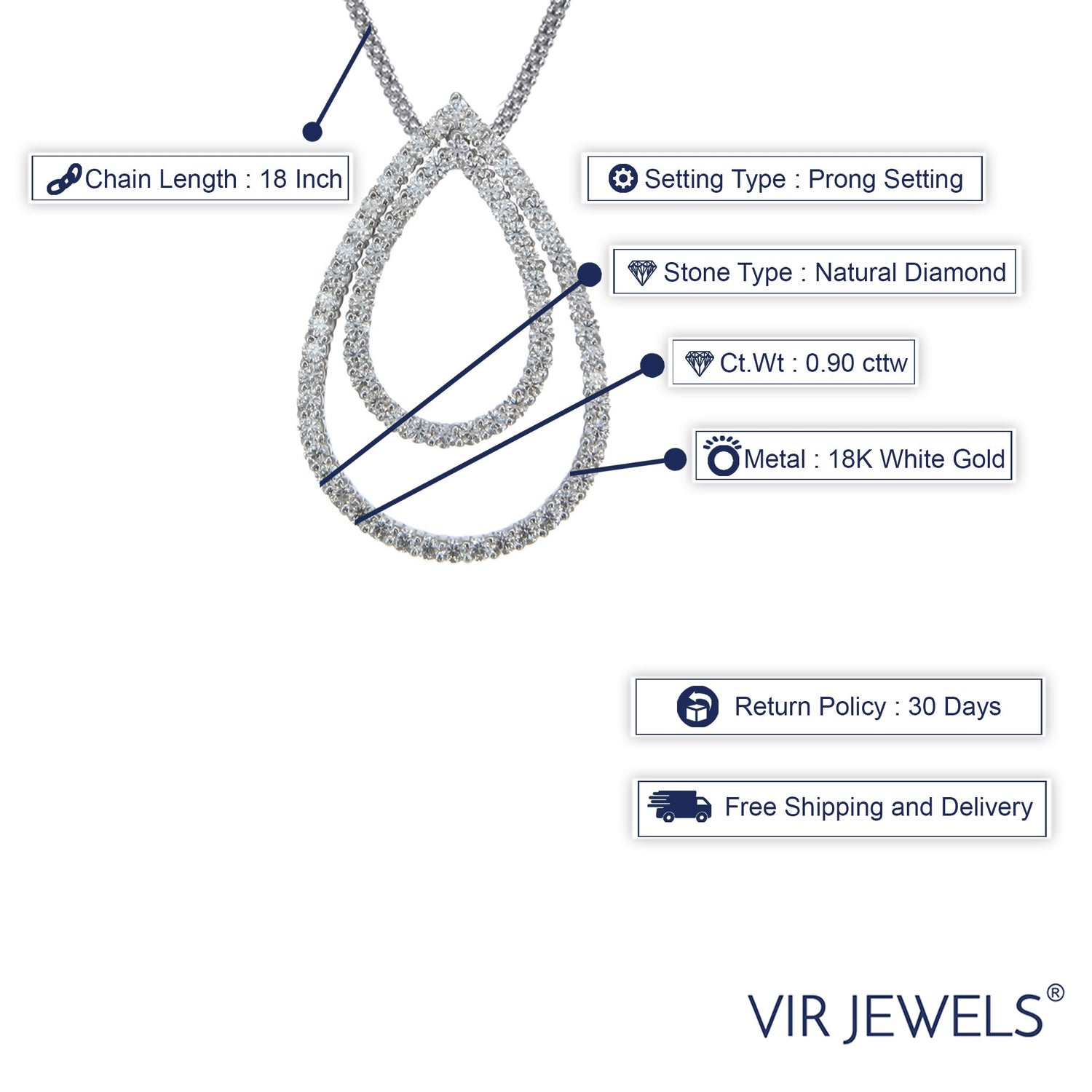 This 0.90 cttw Diamond Pear Pendant Necklace by Vir Jewels is an exquisite expression of timeless beauty. Designed in luxurious 18K white gold, the pear-shaped pendant showcases brilliant diamonds in a refined prong setting, ensuring optimal light reflection. The delicate yet striking silhouette makes this piece perfect for both everyday elegance and formal occasions.