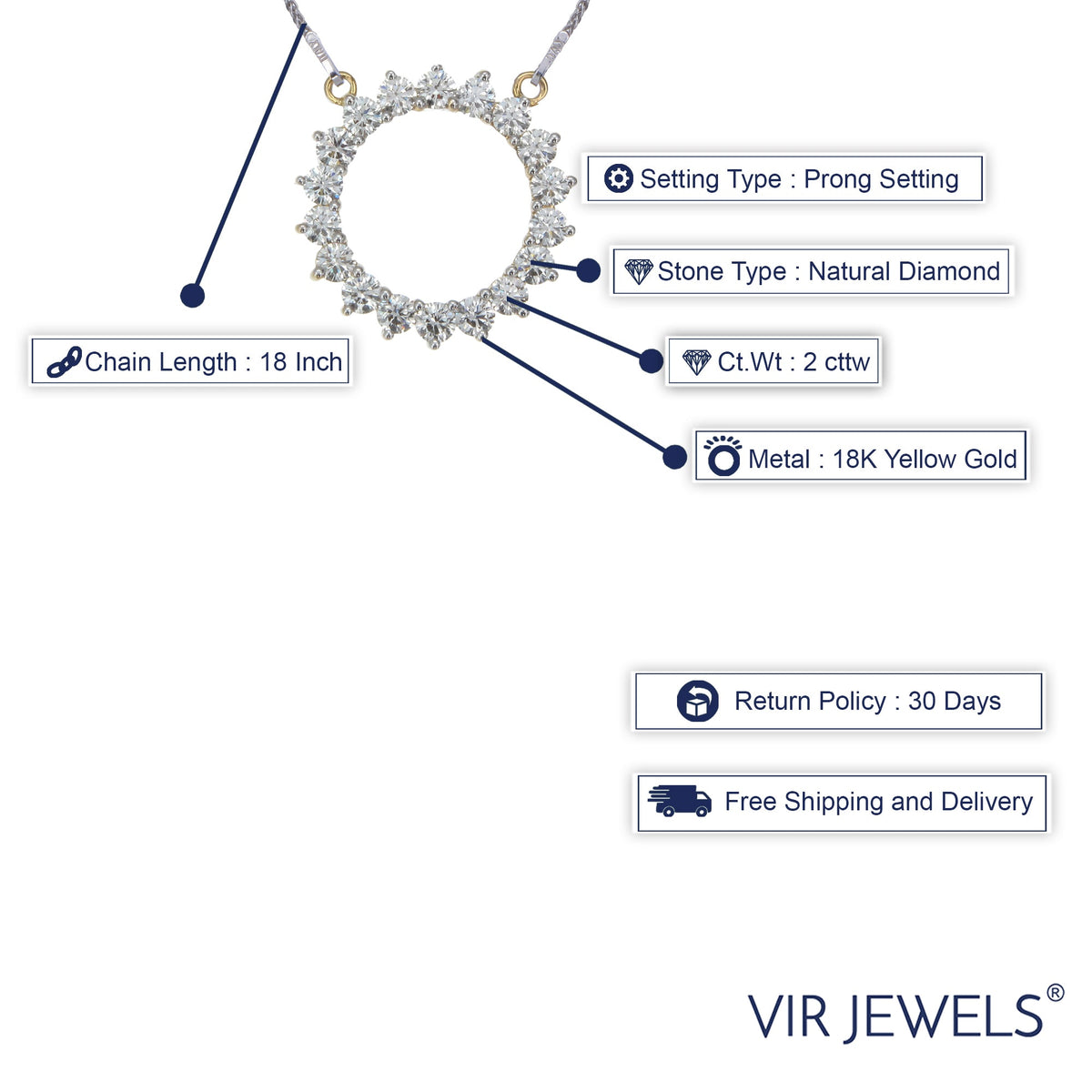 This 2 cttw Diamond Pendant Necklace by Vir Jewels features a captivating circle pendant, set in 18K yellow gold. The prong-set diamonds, totaling 2 carats, create a stunning visual effect that catches the light beautifully. The pendant's timeless design and the luxurious 18K yellow gold ensure this necklace will remain a cherished piece for years to come. Measuring 0.80 inches in length, it is perfect for everyday wear or as a special gift for someone you love.