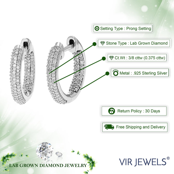 3/8 cttw Diamond Hoop Earrings for Women, Round Lab Grown Diamond Earrings in .925 Sterlinng Silver, Prong Setting, 2/3 Inch