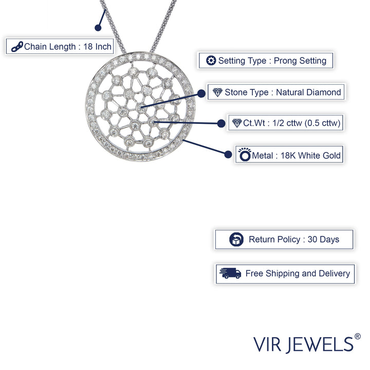 1/2 cttw Diamond Pendant, Diamond Round Pendant Necklace for Women in 18K White Gold with 18 Inch Chain, Prong Setting