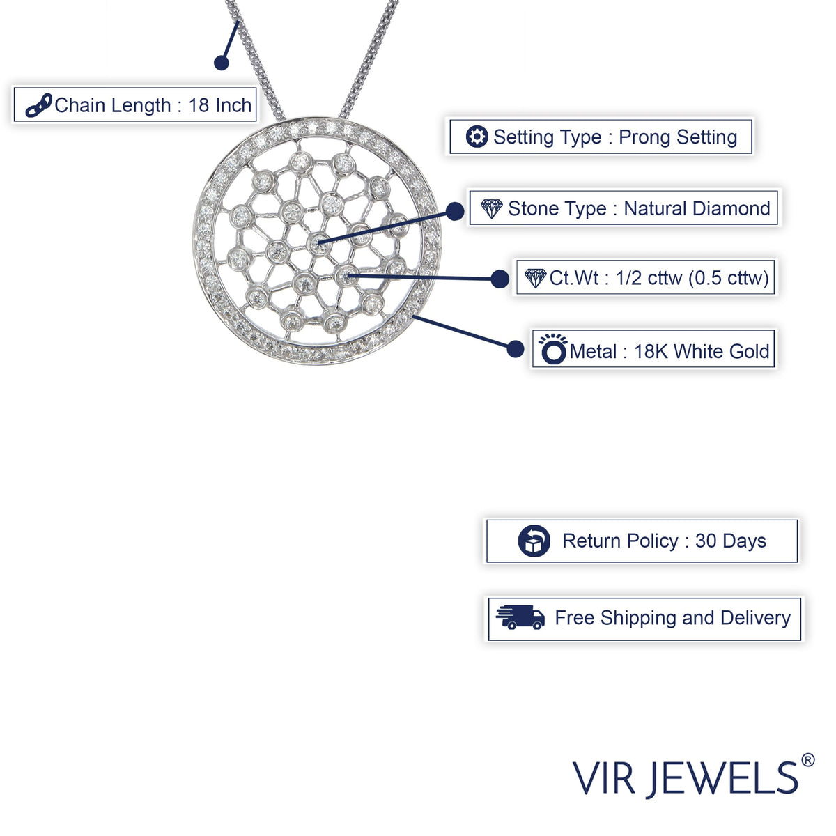 This 1/2 cttw Diamond Pendant Necklace by Vir Jewels is a timeless expression of elegance. Crafted in 18K white gold, the round diamond pendant exudes brilliance in a secure prong setting, ensuring maximum light reflection. Suspended from an 18-inch chain, this pendant is a versatile piece that adds sophistication to both casual and formal ensembles. A beautiful symbol of refinement, this necklace makes a perfect gift or treasured addition to any collection.