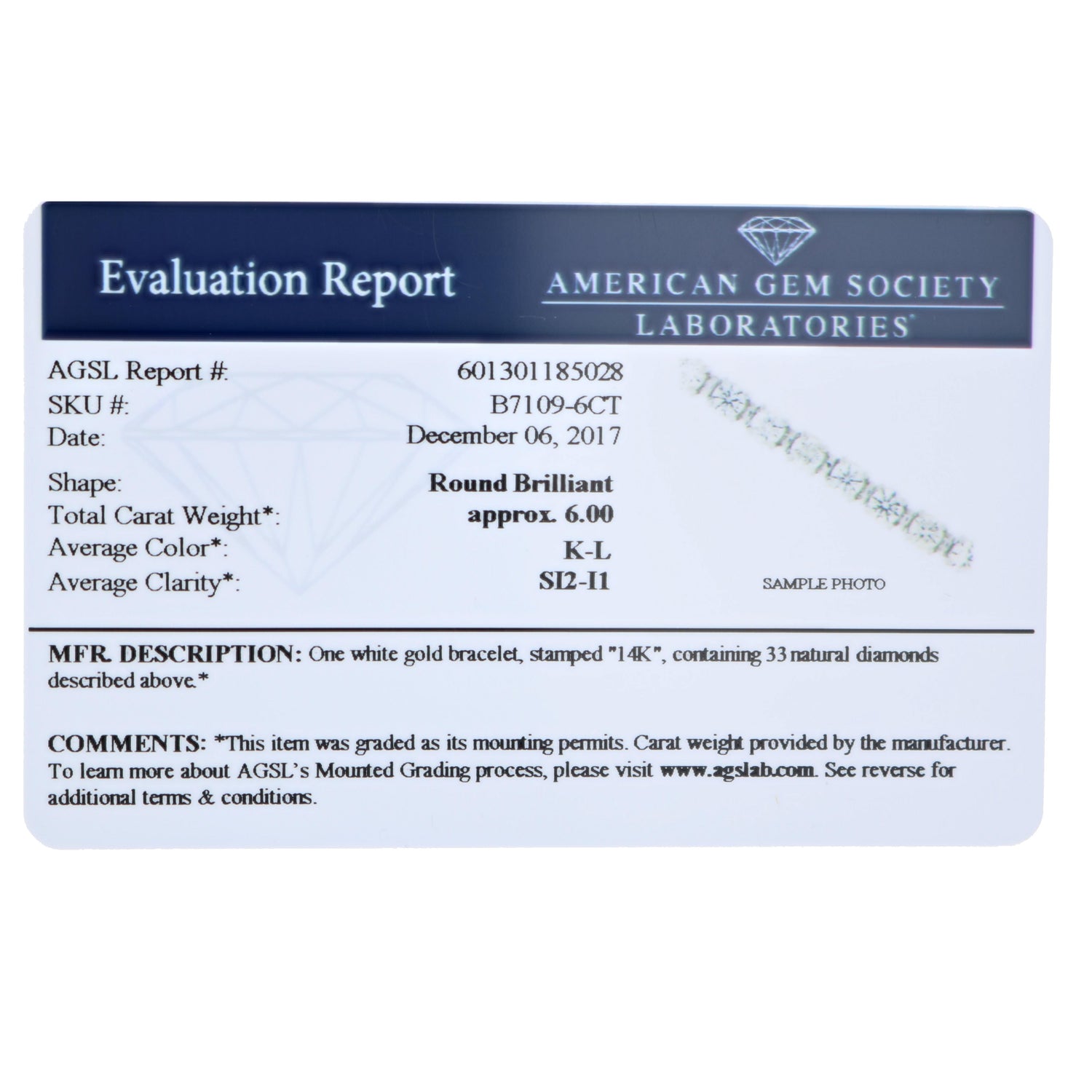 6 CT SI2-I1 AGS Certified 14K White Gold Diamond Tennis Bracelet (K-L)