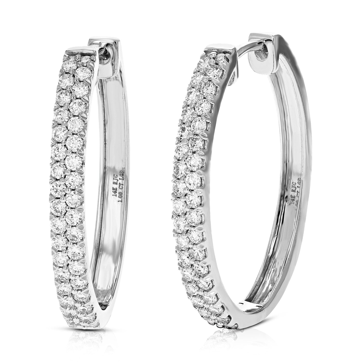 Crafted in 14K white gold with a high-polish finish. Set with 72 round-cut lab-grown diamonds in a secure prong setting. Diamond color: H-I, clarity: SI1-SI2. Total diamond weight: 1.00 cttw. Hoop width: 3mm (1/10 inch), height: 27mm (1 inch).