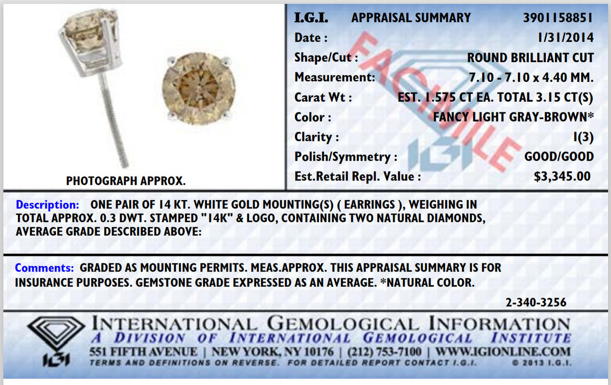 Set in 14K white gold with 3.15 carats of round champagne diamonds (S-T color, I3 clarity). Certified by IGI.