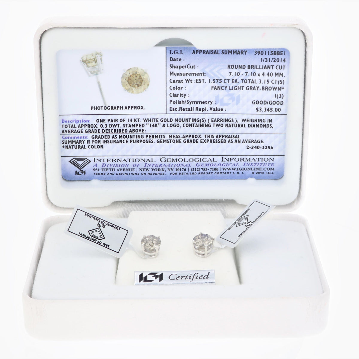 3.15 cttw IGI Certified Champagne Diamond Stud Earrings 14K White Gold Round with Screw Backs