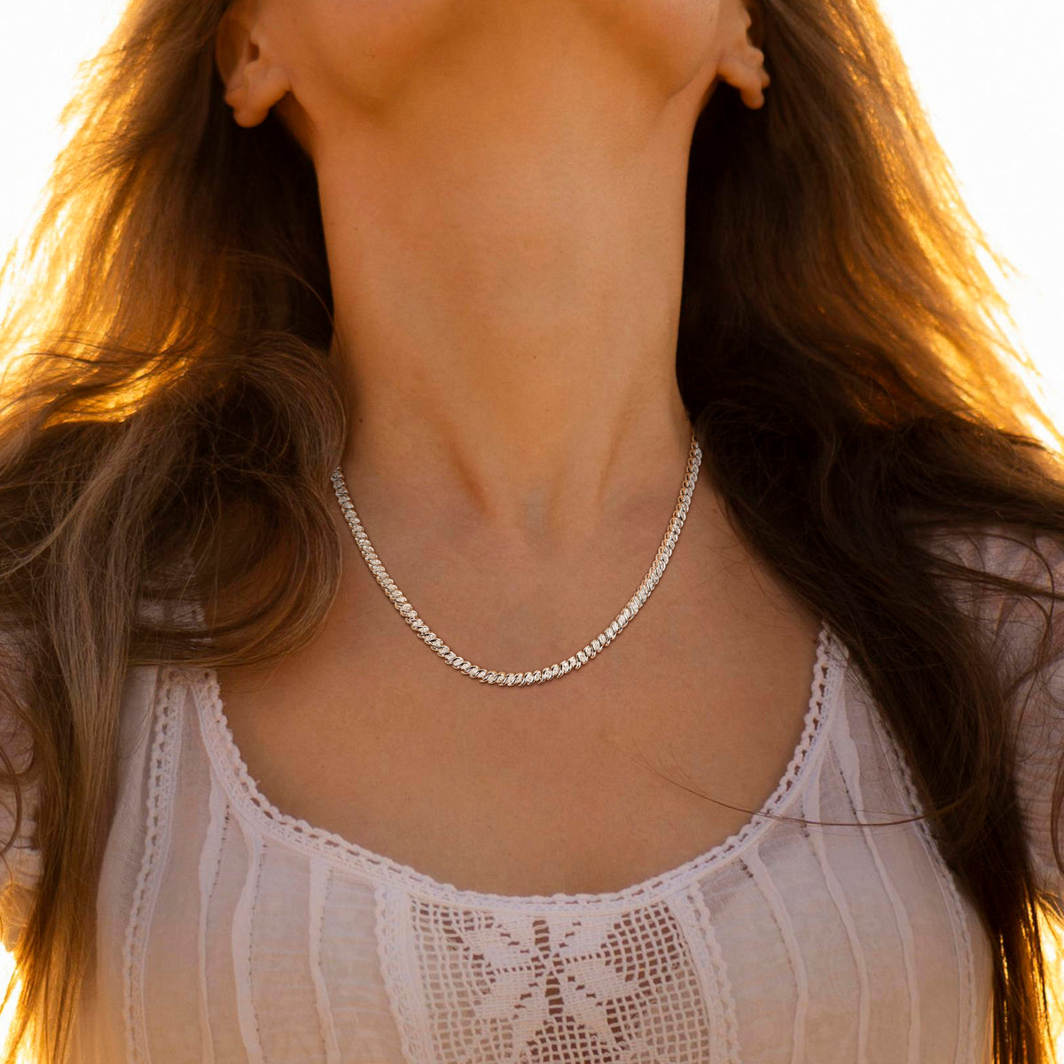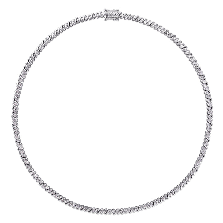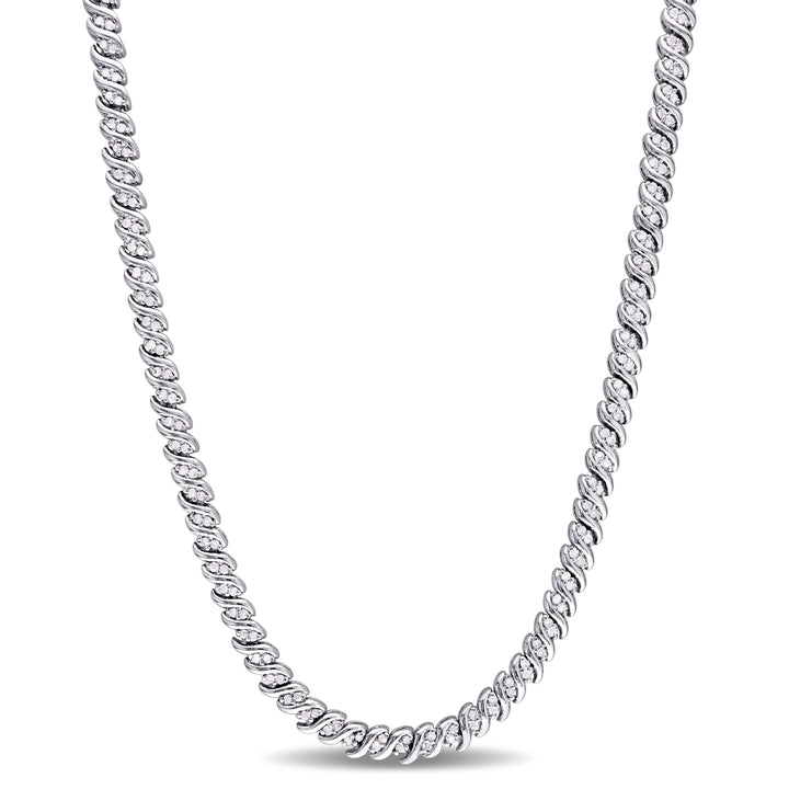 Crafted in sterling silver, featuring 200 round-cut diamonds (H-I, I3) totaling 1ct TDW. Necklace length is 17 inches, secured with a pressure tongue clasp.